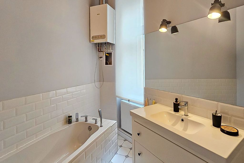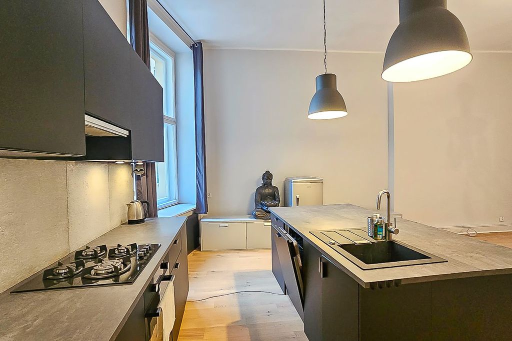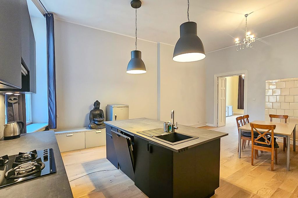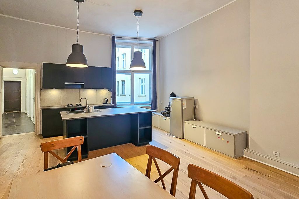 Nowoczesne mieszkanie po remoncie oferuje rozkładowe 4 pokoje, w tym duży salon z aneksem kuchennym i wyspą na środku, 2 sypialnie (jedna z antresolą i balkonem), łazienkę z wanną i garderobę. Wysokość pomieszczeń wynosi aż 330 cm, co sprawia, że przestrzeń wydaje się jeszcze większa.