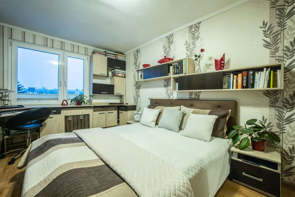- Przestronnej sypialni z szafą, biurkiem do pracy i dużym łóżkiem, co gwarantuje znaczną swobodę,