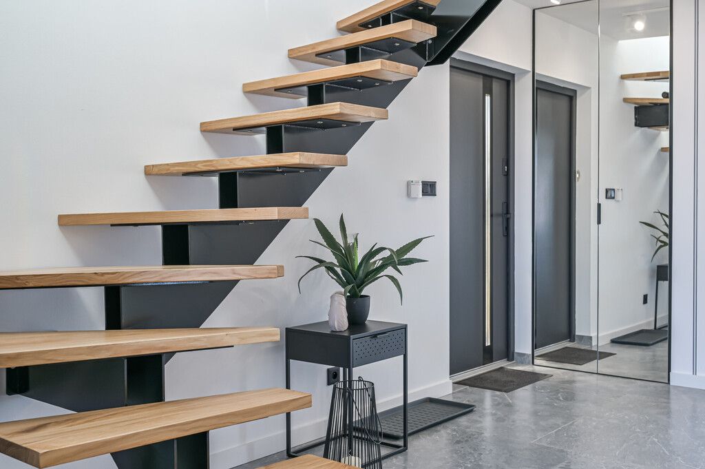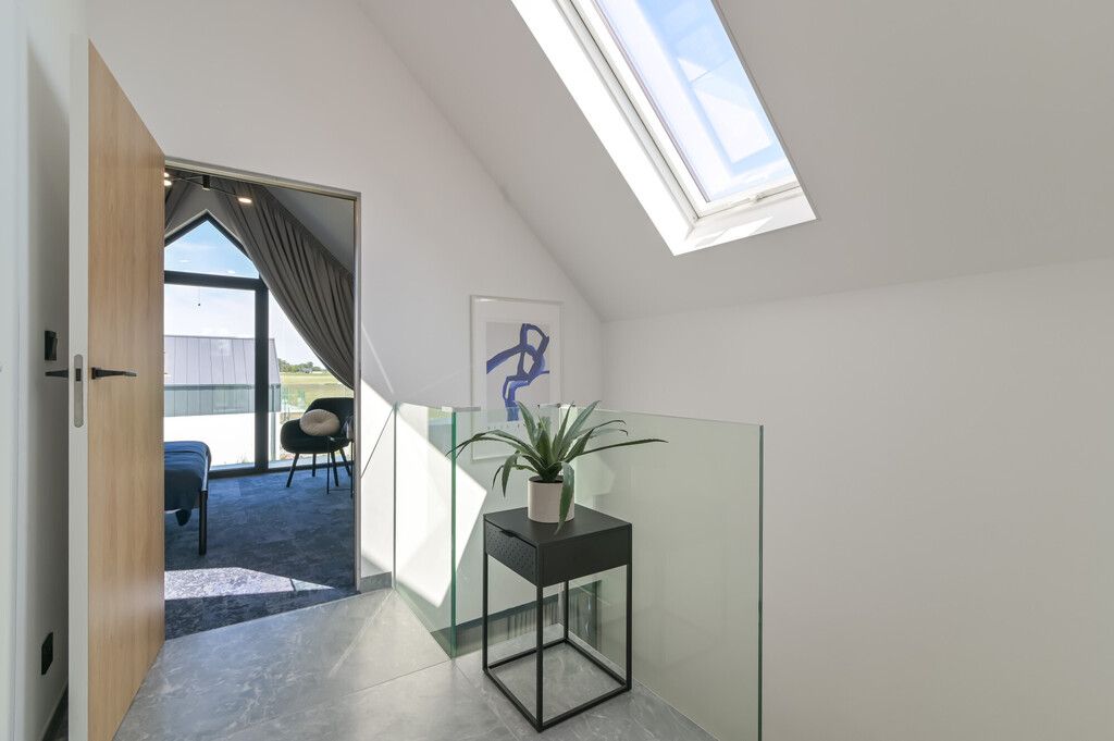 - Wnętrza: gres wielkoformatowy, wykładziny hotelowe, schody stalowo-dębowe, szklane balustrady