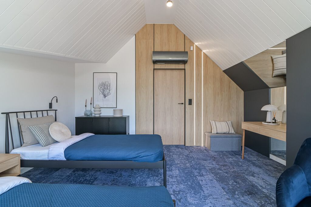 - Komfort: klimatyzacja w salonie i sypialniach, automatyczne karnisze, moskitiery