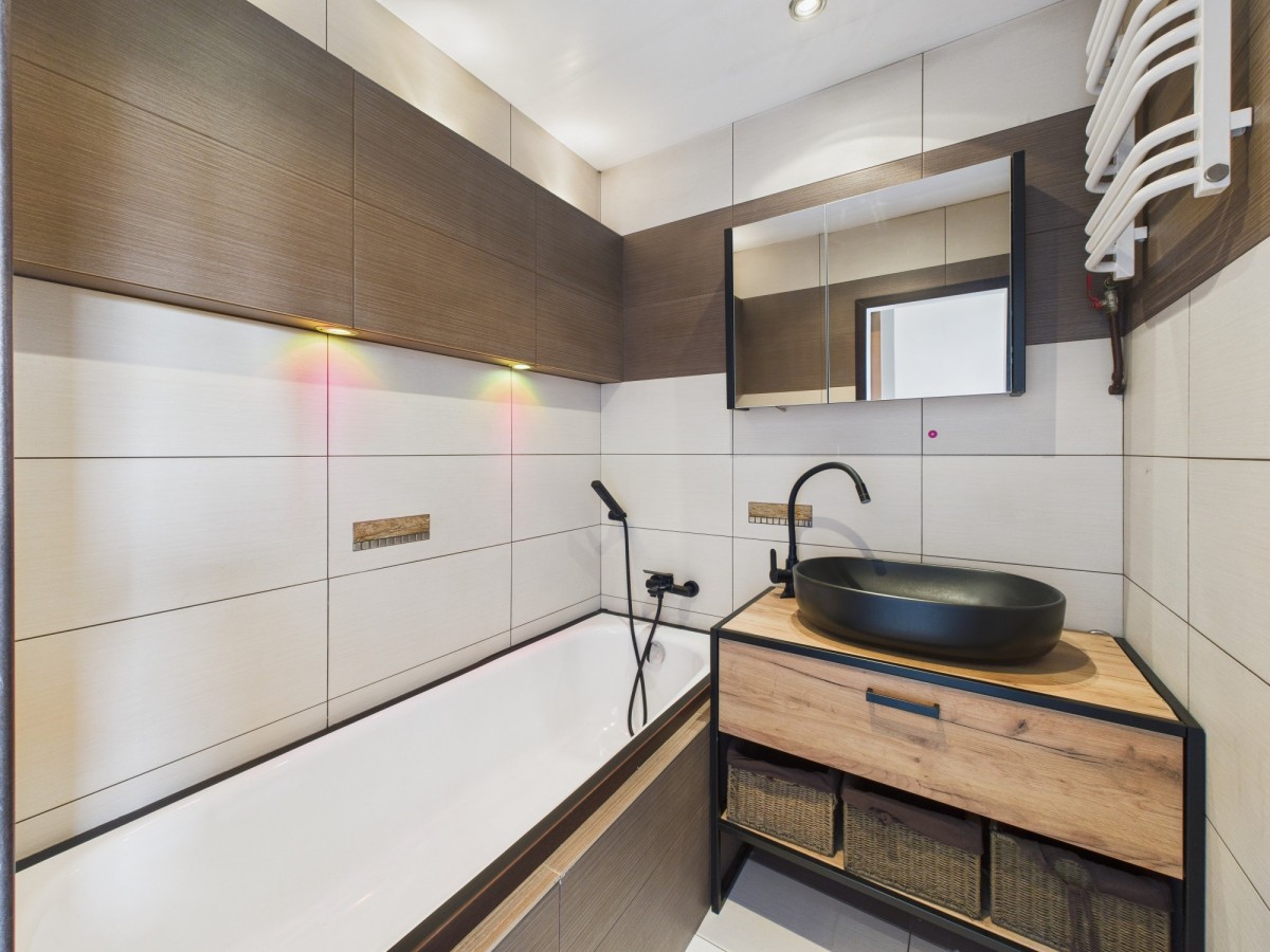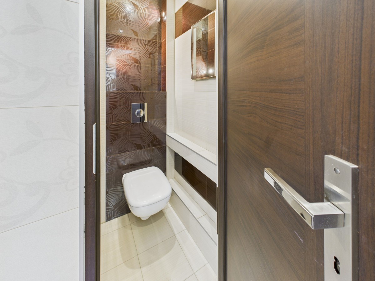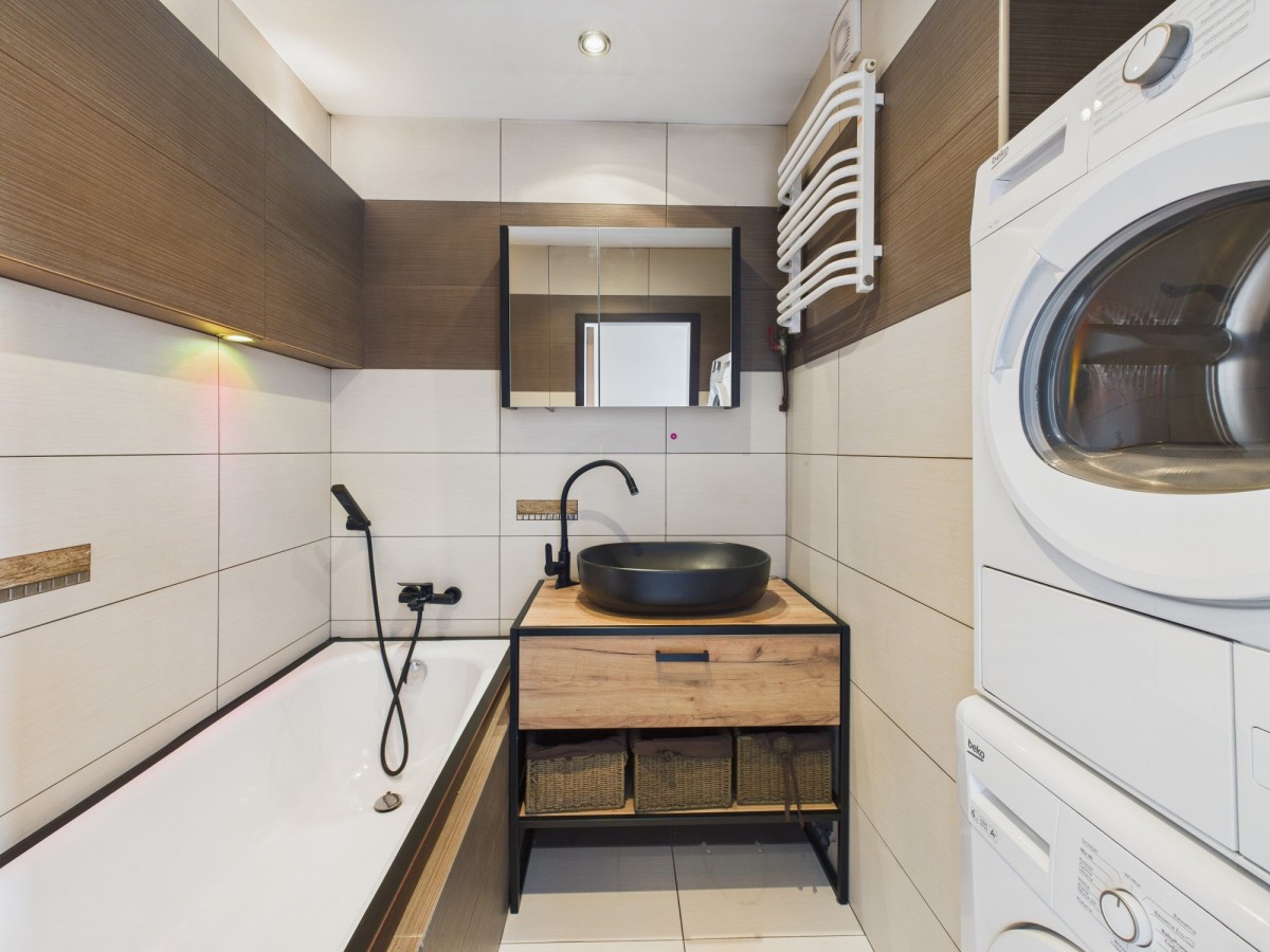 - Łazienka z pralką i suszarką w zabudowie we wnęce;