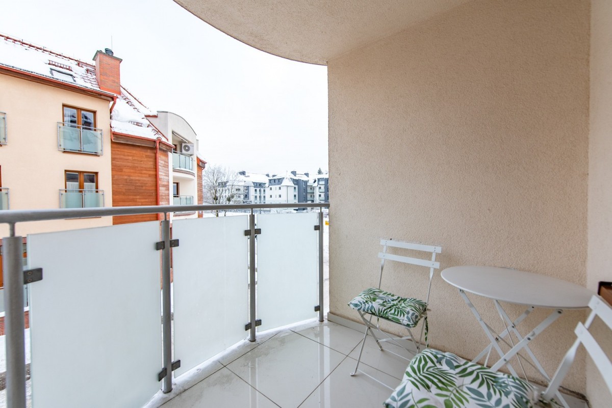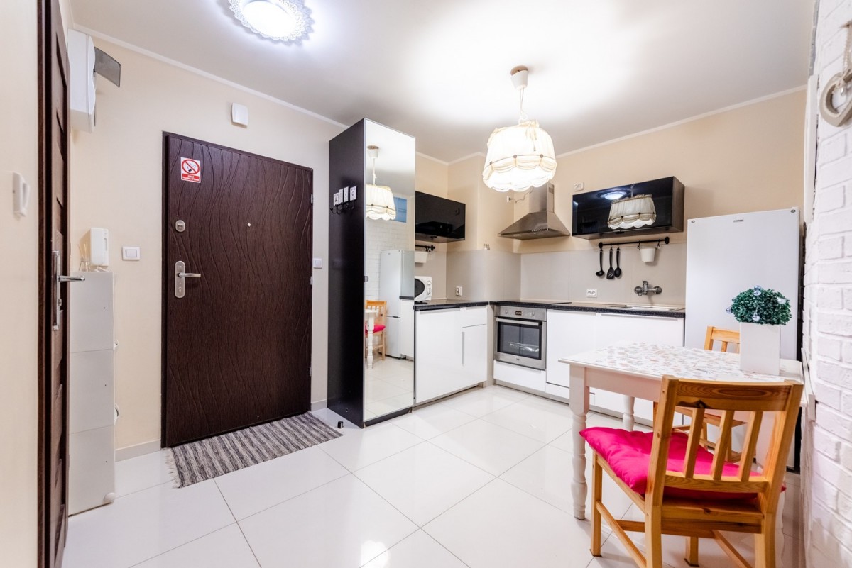 Lokal o powierzchni 36,69 m² składa się z salonu z aneksem kuchennym, sypialni oraz nowoczesnej łazienki. Z salonu prowadzi wyjście na balkon. Mieszkanie jest w pełni wykończone i umeblowane; wykończenie obejmuje wysokiej jakości materiały oraz sprzęt AGD.