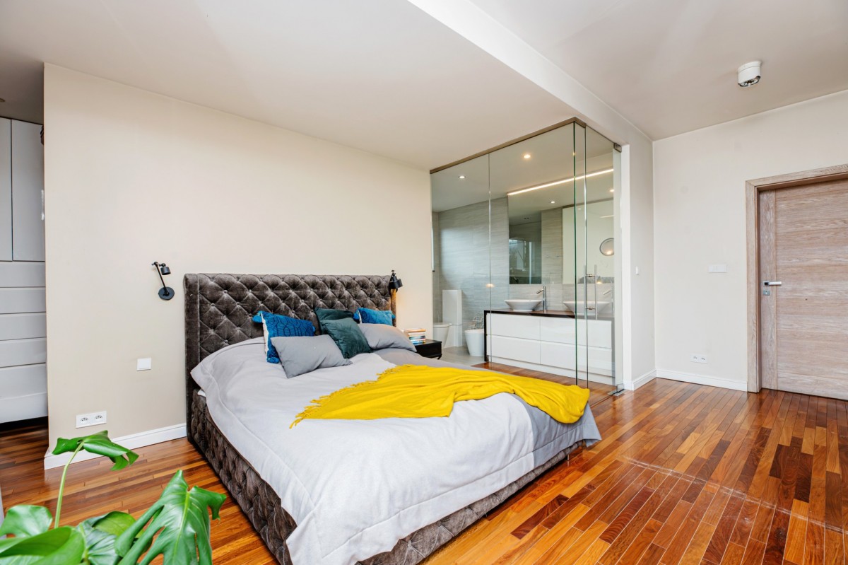 Dom oferuje przestronną część dzienną z możliwością połączenia salonu z jadalnią i kuchnią, liczne sypialnie, łazienki oraz pomieszczenia techniczne i gospodarcze. Duże przeszklenia zapewniają doskonałe doświetlenie wnętrz i kontakt z ogrodem.