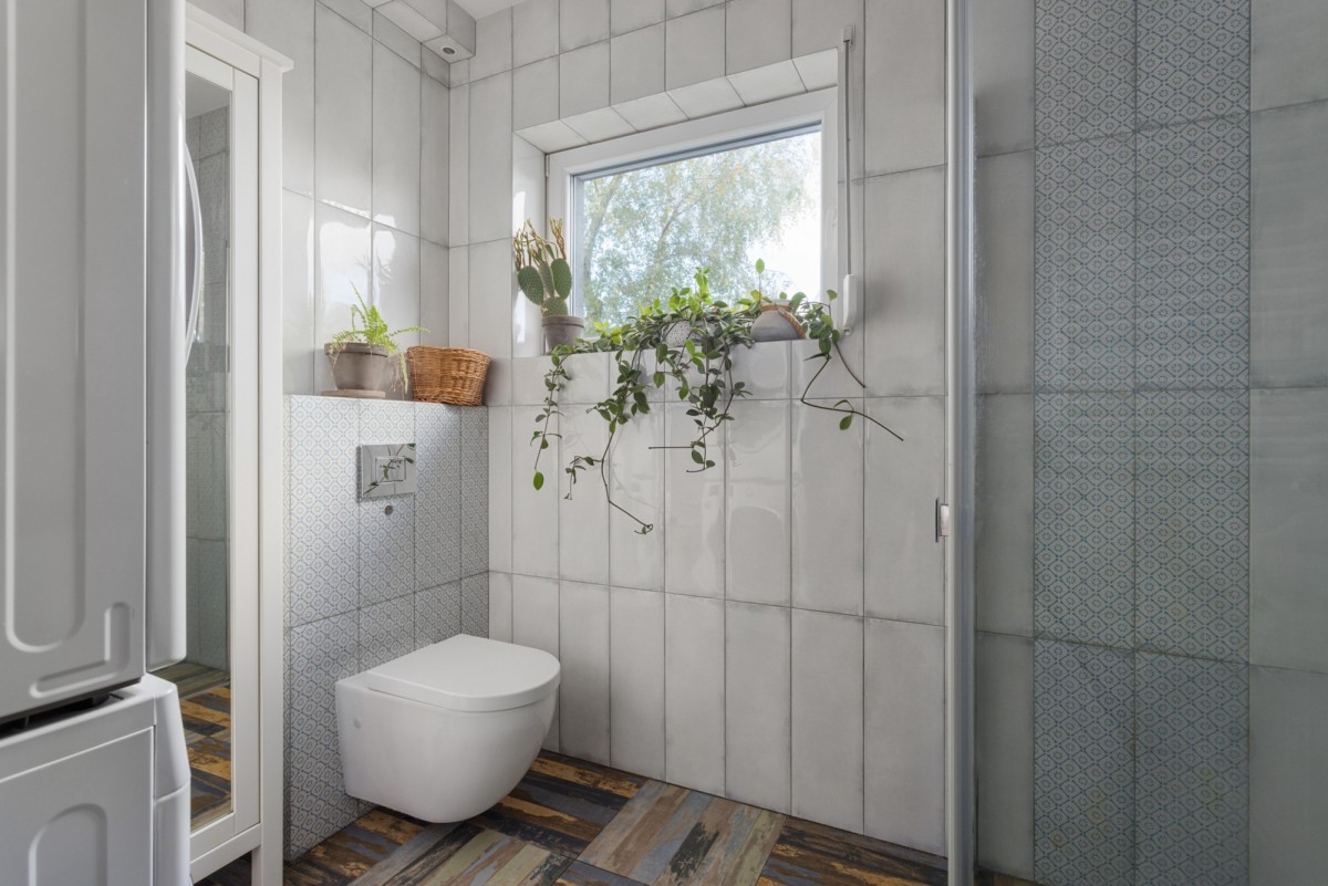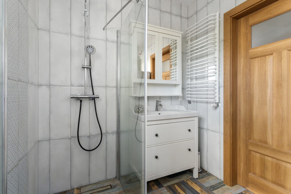 - łazienka z przestronnym prysznicem i miejscem na pralkę,