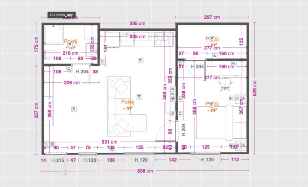 - Sypialnia – ustawna, z miejscem na łóżko i biurko,