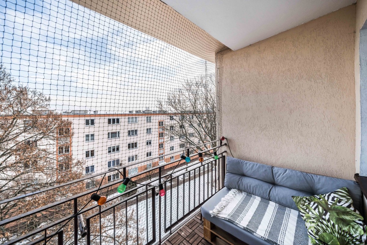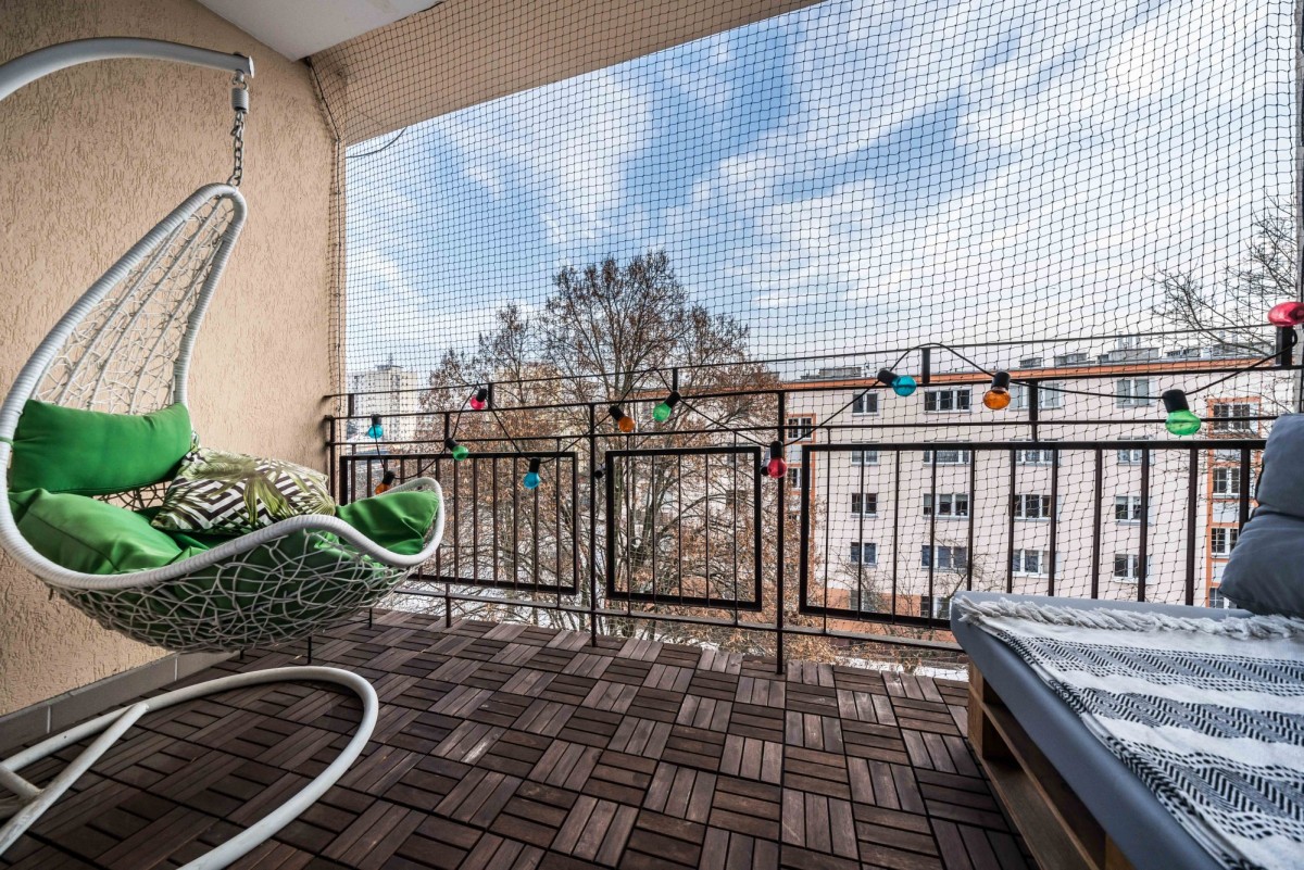 • wyjście na duży balkon typu loggia, otwierany na oścież (idealny jako przedłużenie salonu w sezonie wiosenno-letnim), profesjonalnie zabezpieczony siatką przeciw ptakom