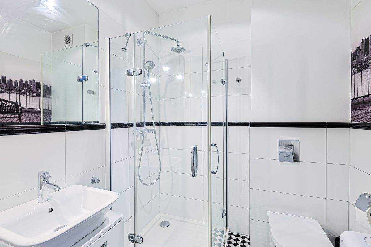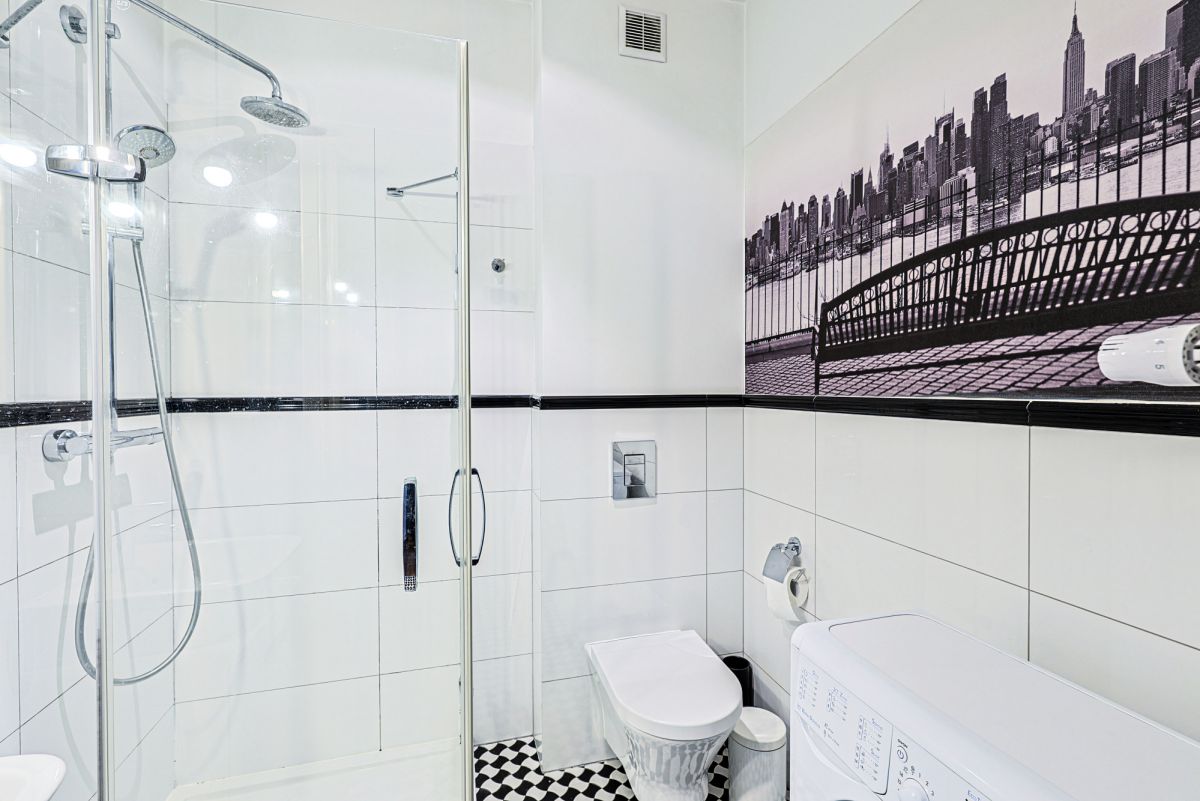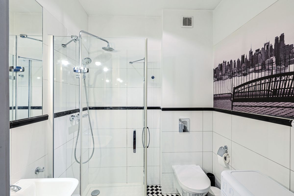 - Łazienki z kabiną prysznicową, umywalką z szafką i pralką