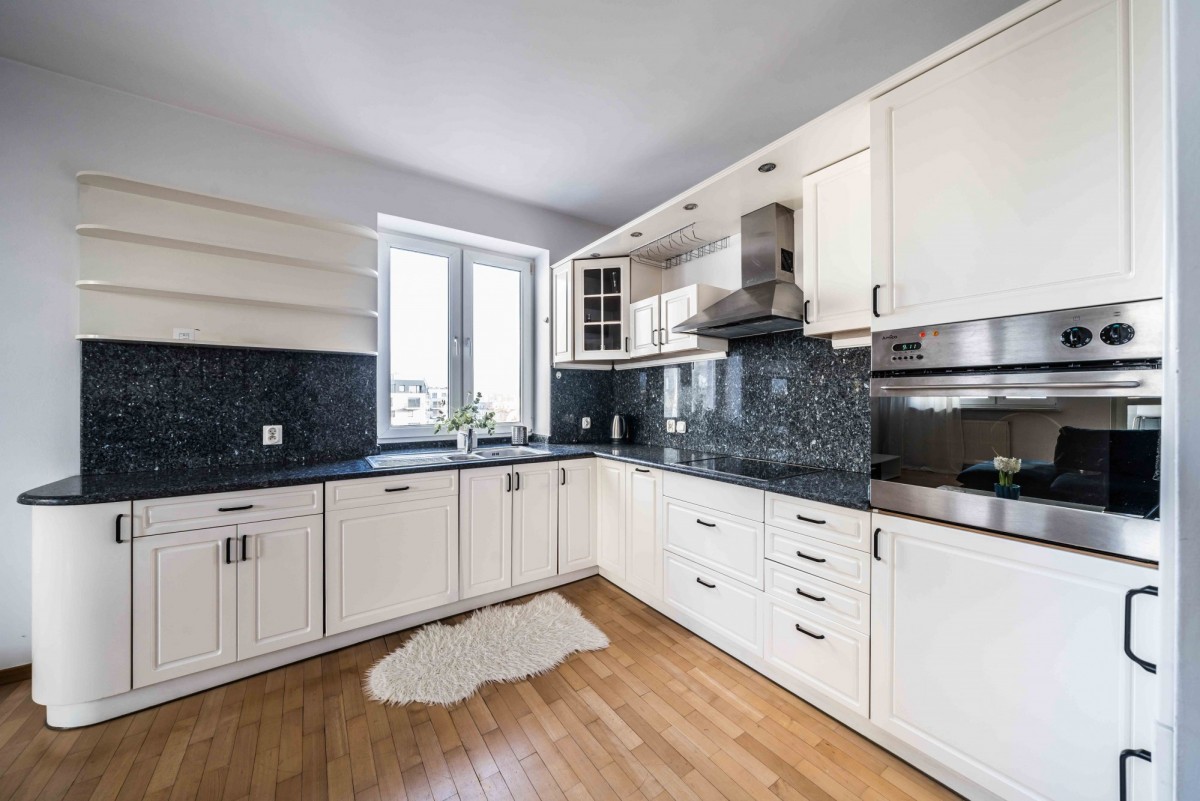 - wyposażona kuchnia z meblami w zabudowie (lodówko-zamrażarka, zmywarka, płyta elektryczna, piekarnik);