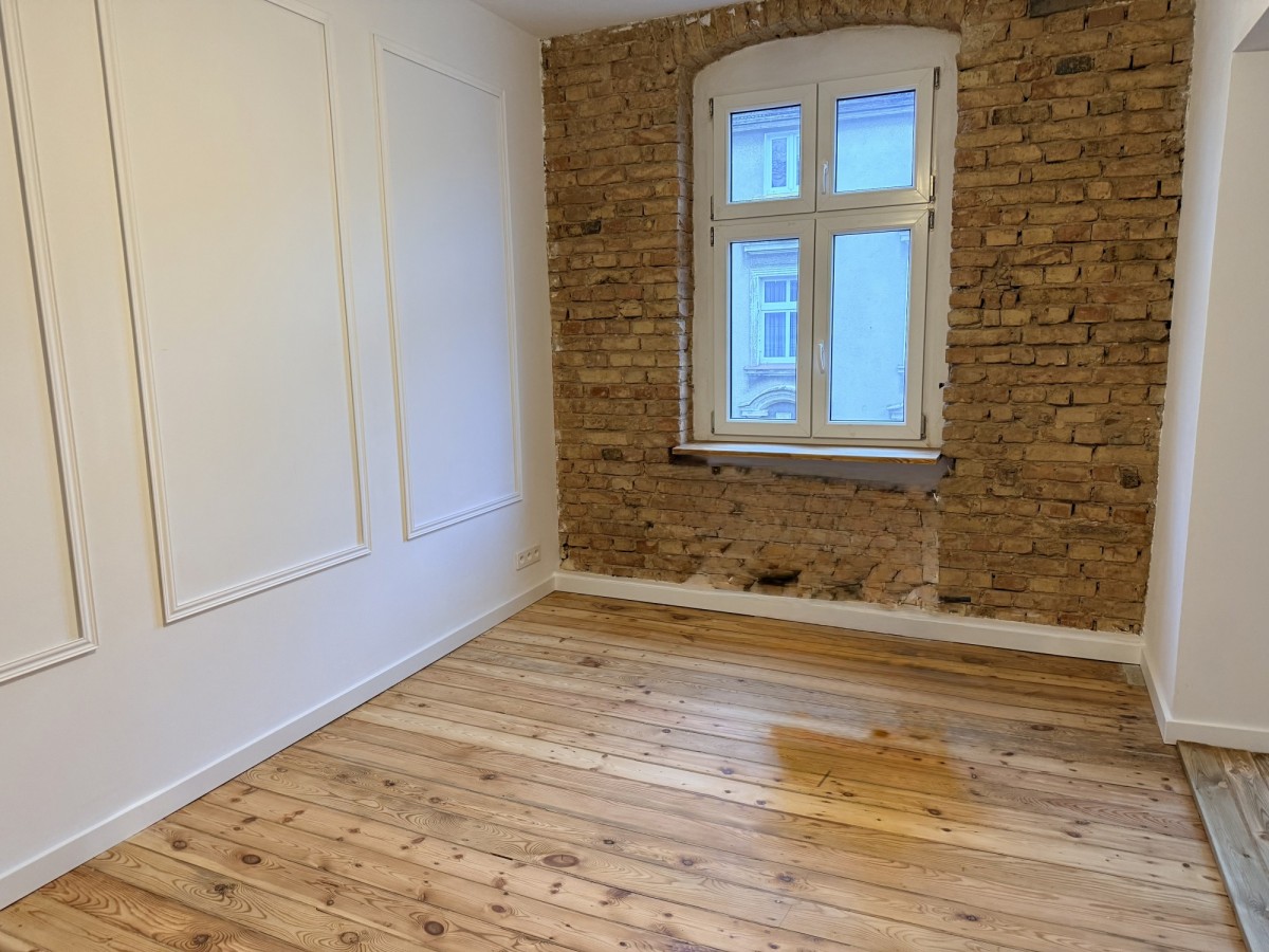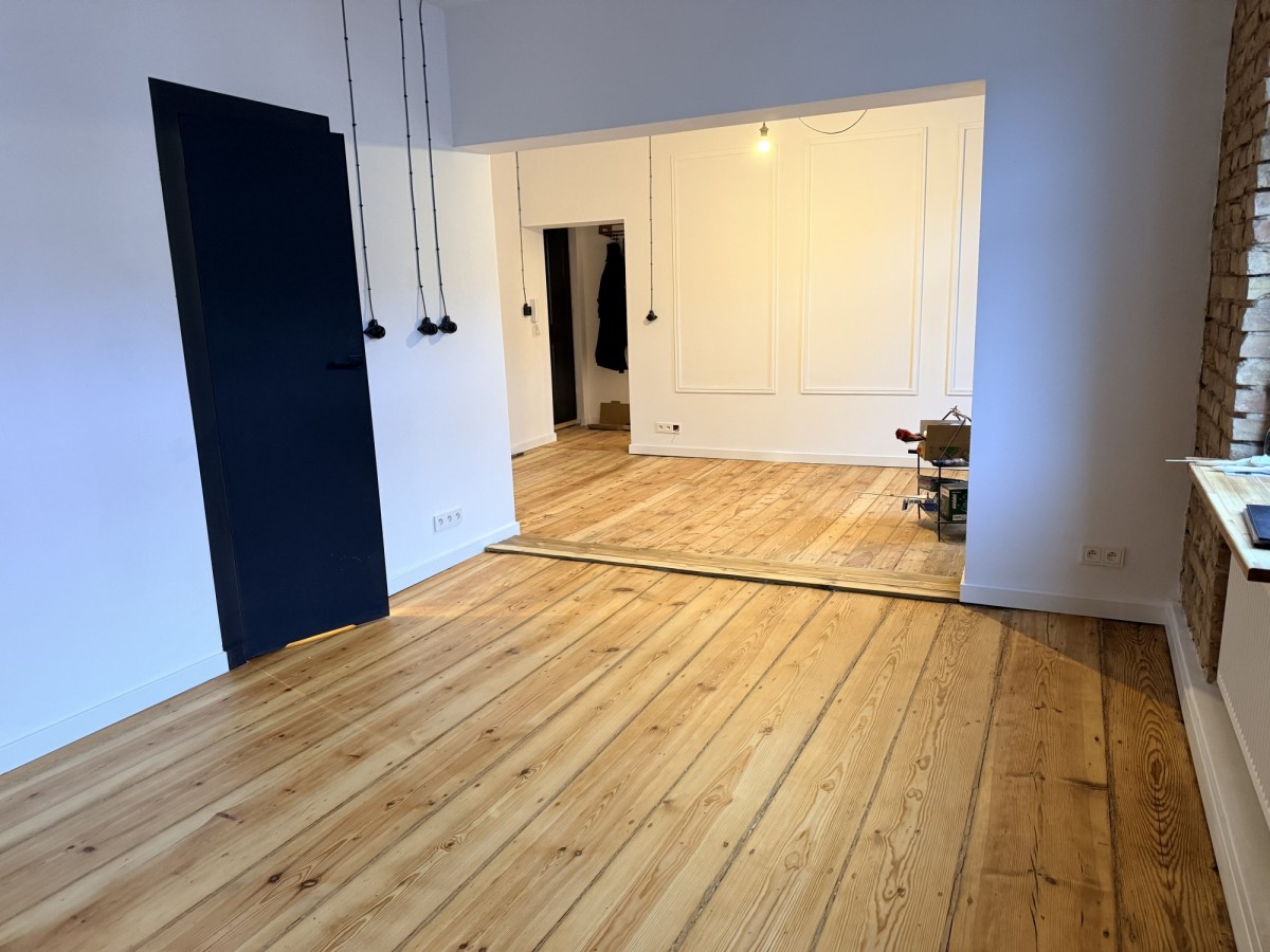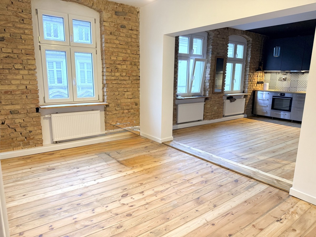 To mieszkanie się wyróżnia: remont wydobył charakter zabytkowej jeżyckiej kamienicy w nowoczesnym wydaniu. Wysokie sufity, oryginalne drewniane podłogi, odkryta cegła.
