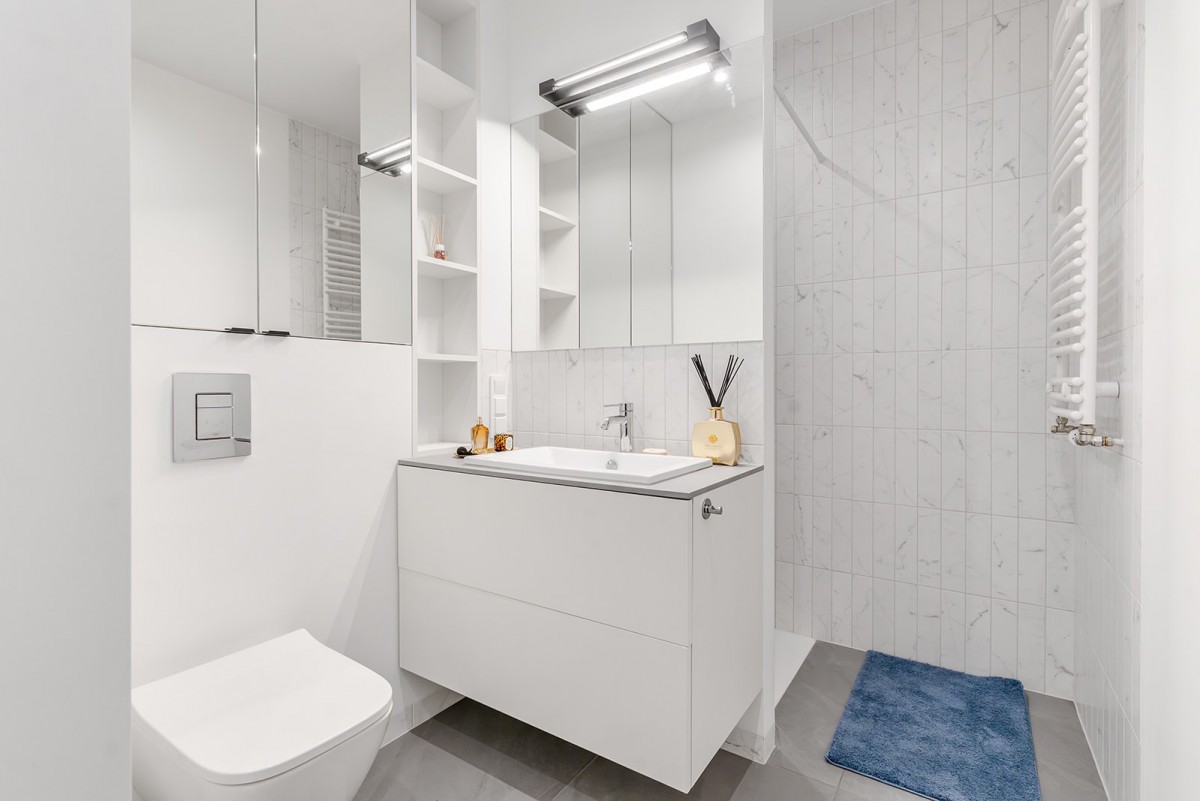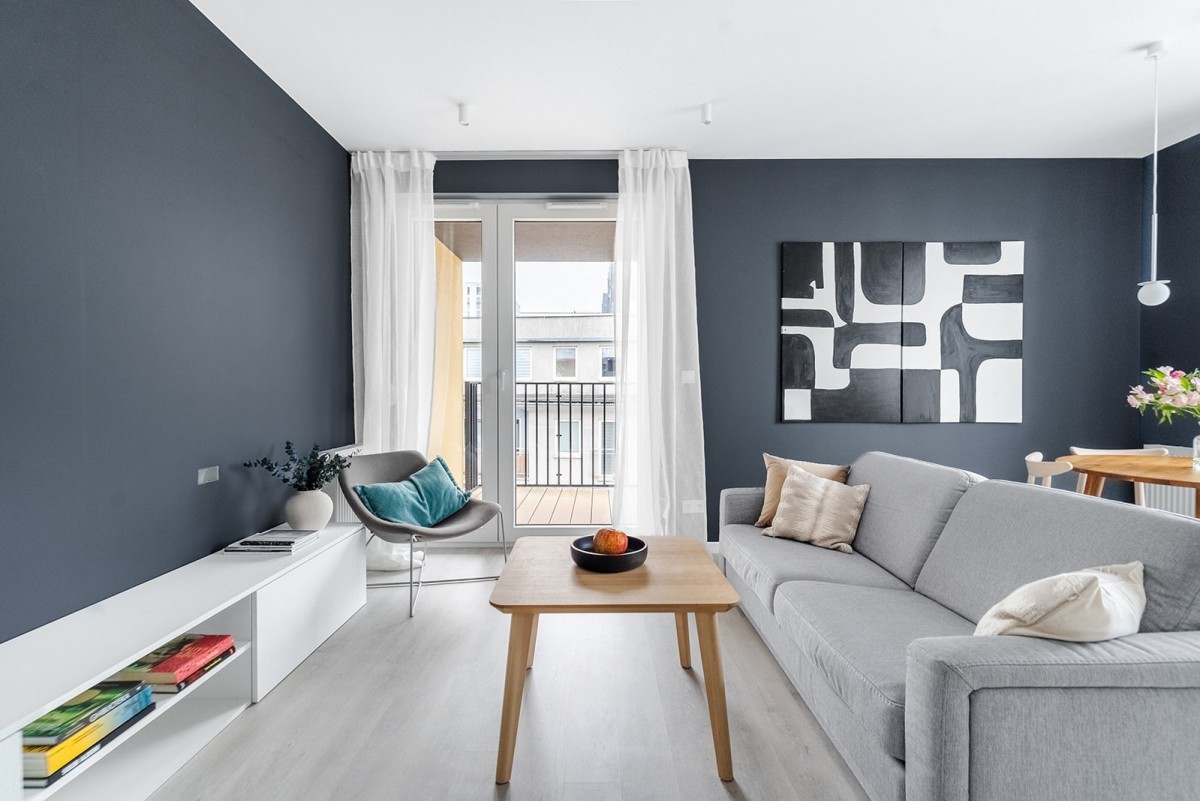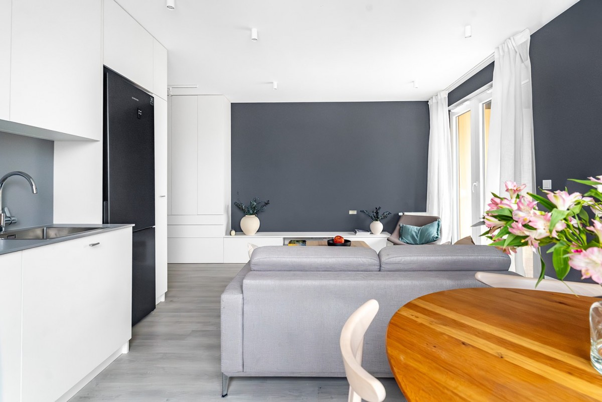 Wnętrze zostało wykończone z najwyższą dbałością o detale, a jego sercem jest przestronny salon z aneksem kuchennym. W każdym z pomieszczeń wykonana została zabudowa stolarska według indywidualnego projektu, co gwarantuje maksymalną funkcjonalność i spójność estetyczną. Apartament oferuje przestronną sypialnię z podwójnym łóżkiem oraz drugi pokój zaaranżowany na nowoczesny Home Office z dwoma biurkami sterowanymi elektrycznie.