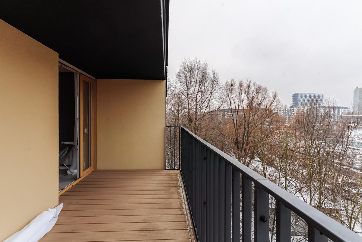 Taras 12 m²: Duży, zadaszony balkon idealny do odpoczynku przy zachodzie słońca.
