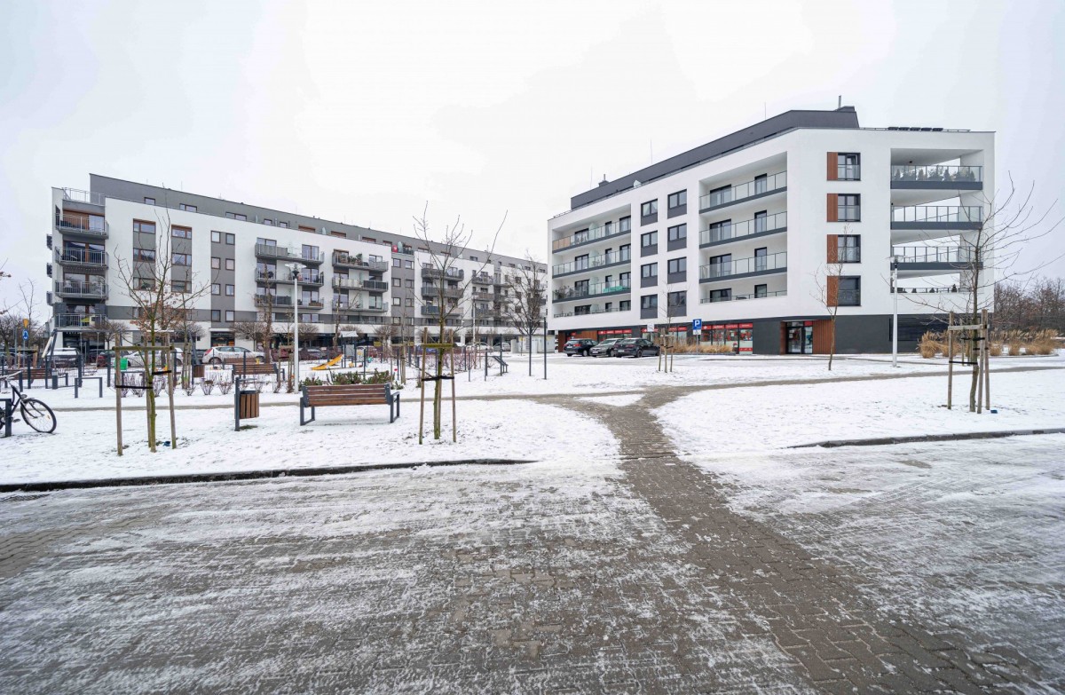 spokojna, nowoczesna zabudowa mieszkaniowa.