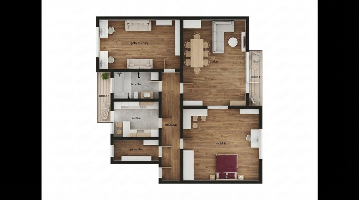 Do tego osobna kuchnia ze spiżarką i drugim balkonem, łazienka z wanną i prysznicem (z wydzieloną strefą mokrą i suchą) oraz przestronny korytarz z zabudową stolarską.