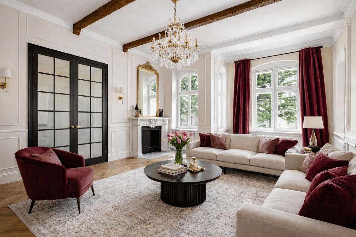 - 4 przestronne, ustawne pokoje, w tym dwa największe o powierzchni 32,7 m² oraz 18,8 m², z możliwością połączenia w reprezentacyjny salon z jadalnią (zachowane oryginalne dębowe drzwi przesuwne)