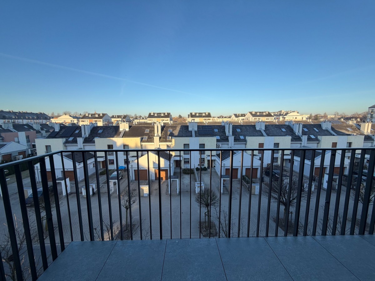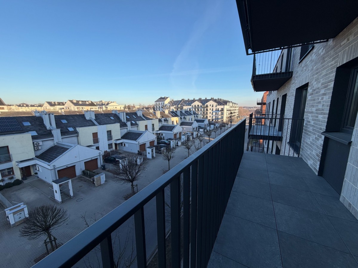 Balkon o komfortowych wymiarach - mieści stolik i fotele ogrodowe. Widok na niską zabudowę szeregową zapewnia większą prywatność i poczucie przestrzeni.