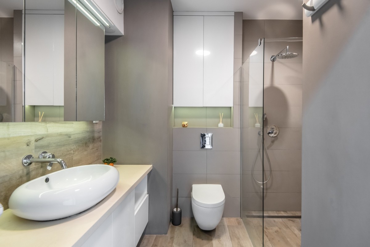 Łazienka - ok. 5 m² - z prysznicem typu walk-in, deszczownicą i odpływem liniowym, ogrzewaniem podłogowym oraz wbudowanymi głośnikami bluetooth.