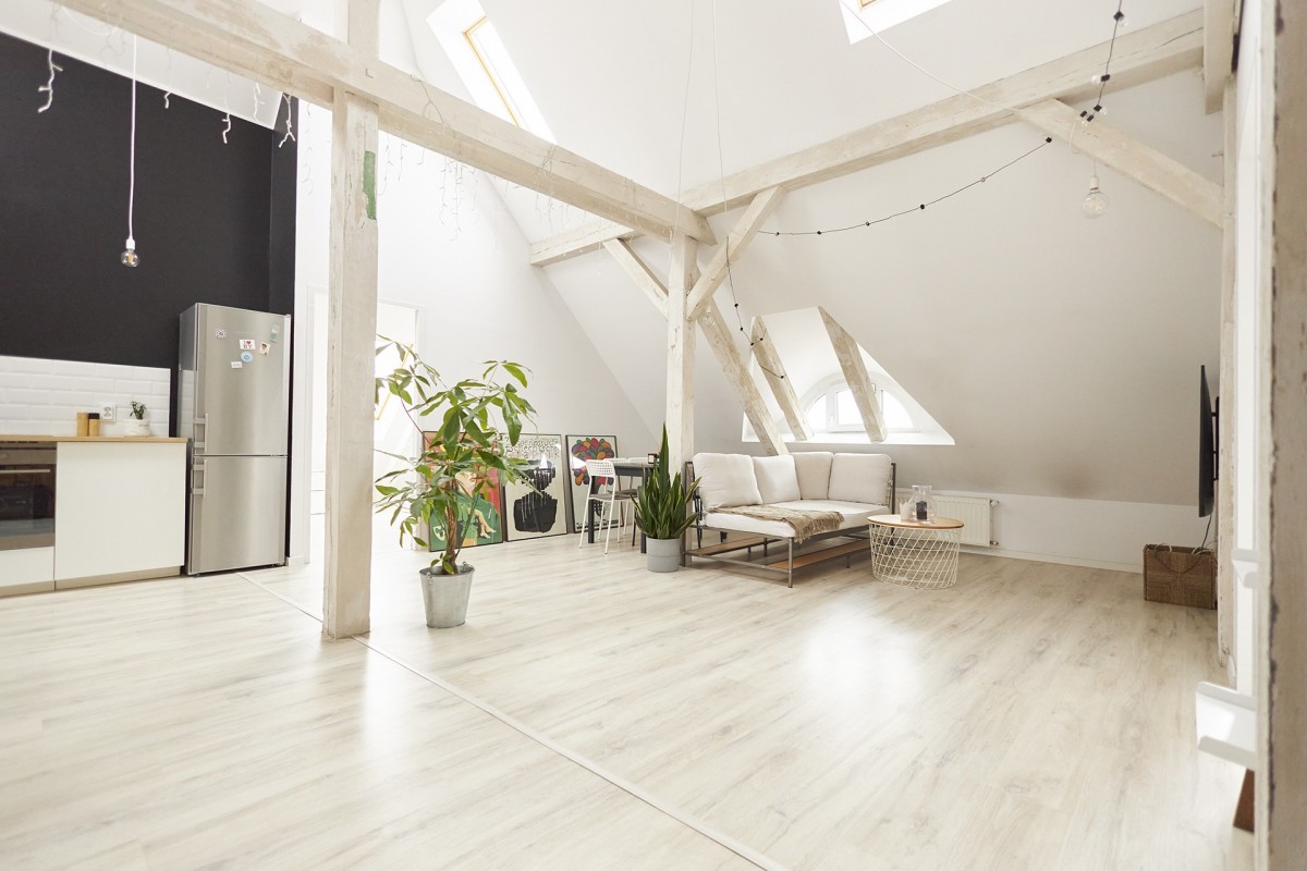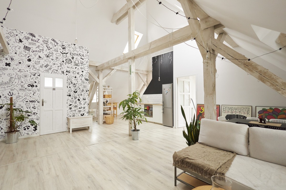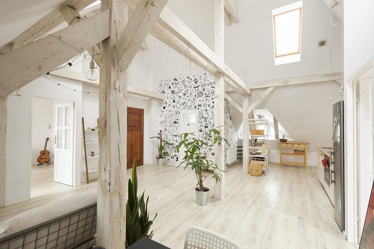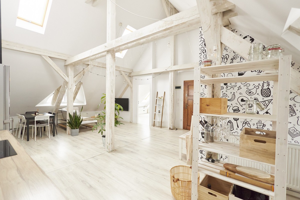- Stylowe wykończenie, jasne wnętrza, charakterystyczne drewniane belki