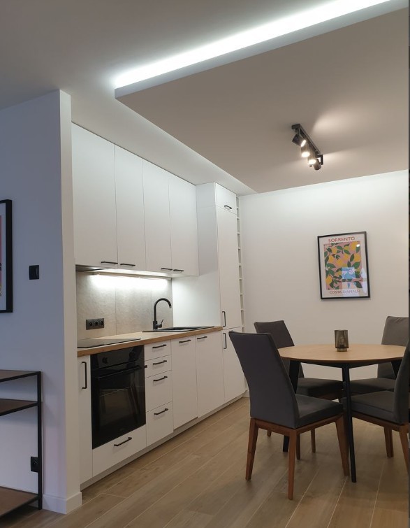 układ: 2 pokoje - sypialnia oraz przestronny open space z nowoczesnym aneksem kuchennym