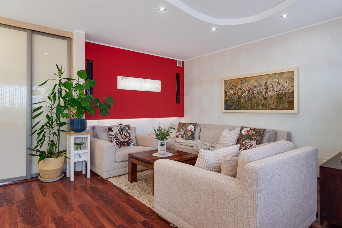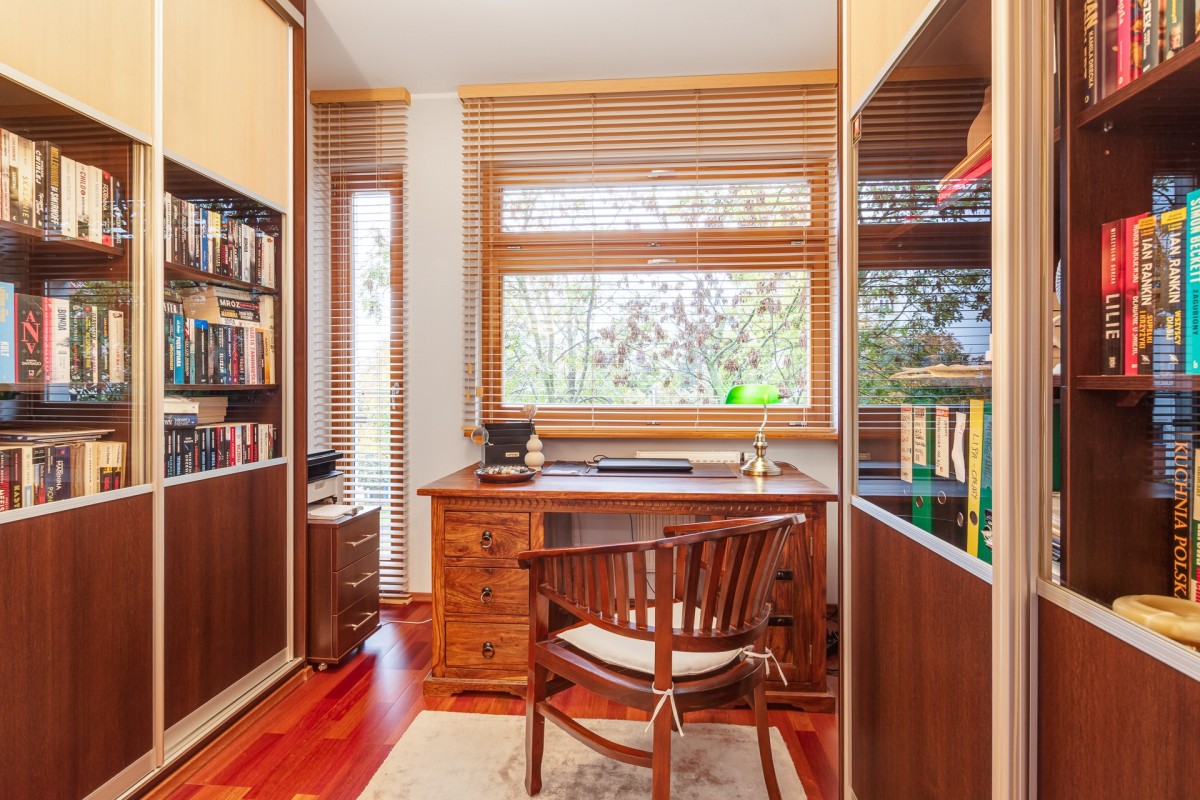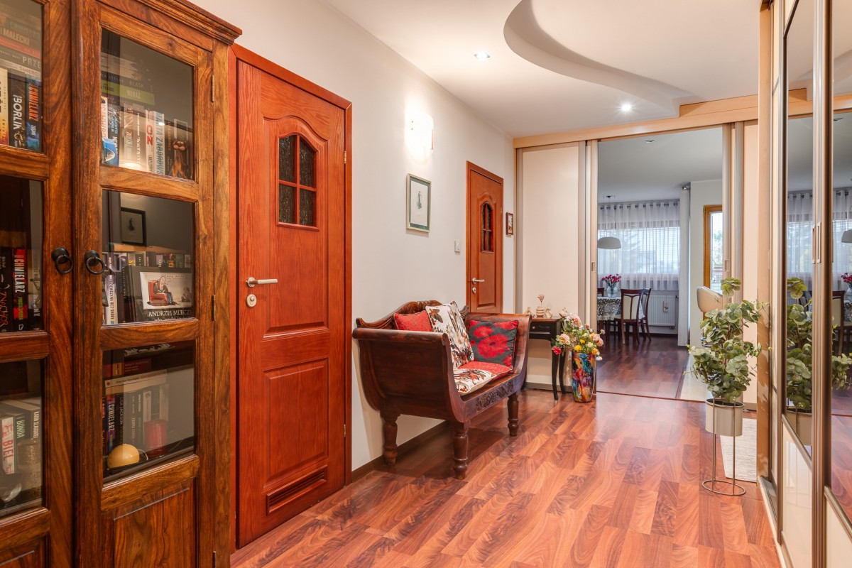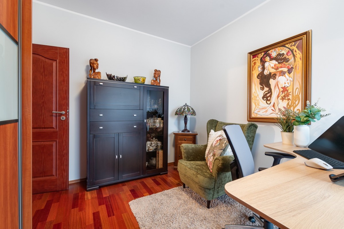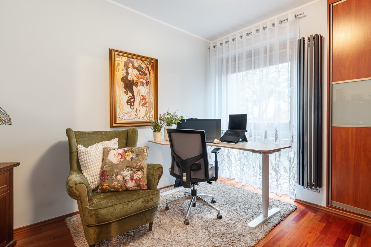 Mieszkanie o powierzchni 106,6 m², wraz z komórką lokatorską, położone jest w ciekawym, architektonicznie wyróżniającym się budynku z reprezentacyjną klatką schodową. Składa się z przestronnego salonu z aneksem kuchennym i wydzieloną jadalnią, z którego prowadzi wyjście na balkon. Duże okna w salonie i pozostałych pomieszczeniach zapewniają doskonałe doświetlenie wnętrz przez cały dzień. W części prywatnej znajdują się dwie komfortowe sypialnie oraz funkcjonalne biuro, idealne do pracy zdalnej lub jako dodatkowy pokój gościnny. Mieszkanie posiada dwie łazienki - główną z wanną oraz mniejszą z prysznicem - a także korytarz z szafkami w zabudowie. Całość tworzy nowoczesną, wygodną i dobrze przemyślaną przestrzeń do życia.