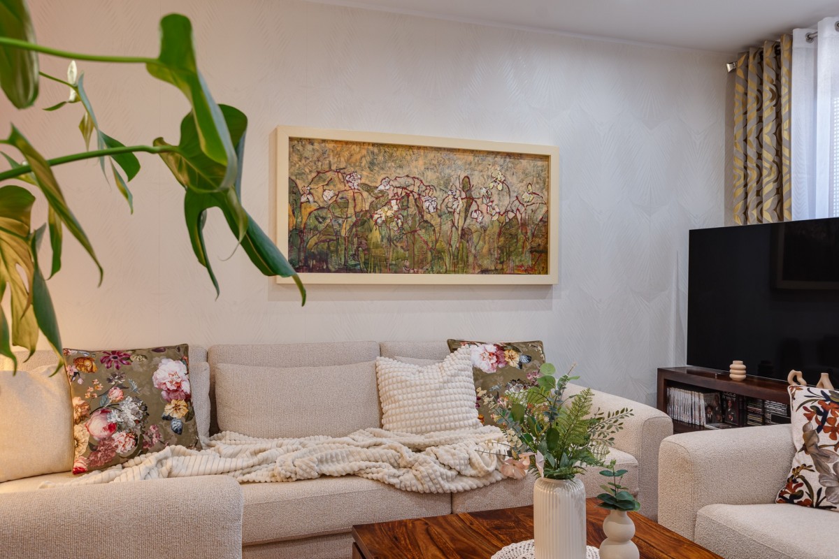 - salon z aneksem kuchennym i wydzieloną jadalnią + wyjście na balkon,