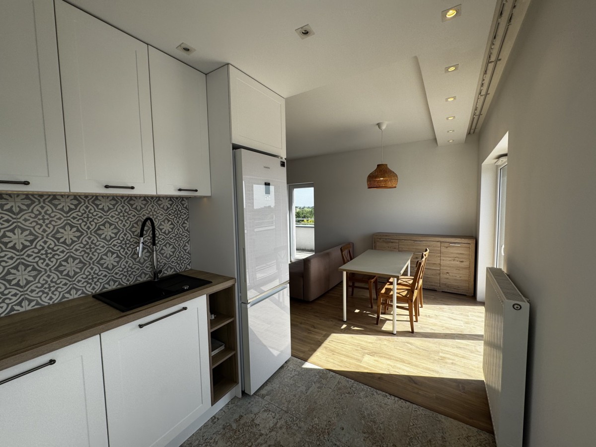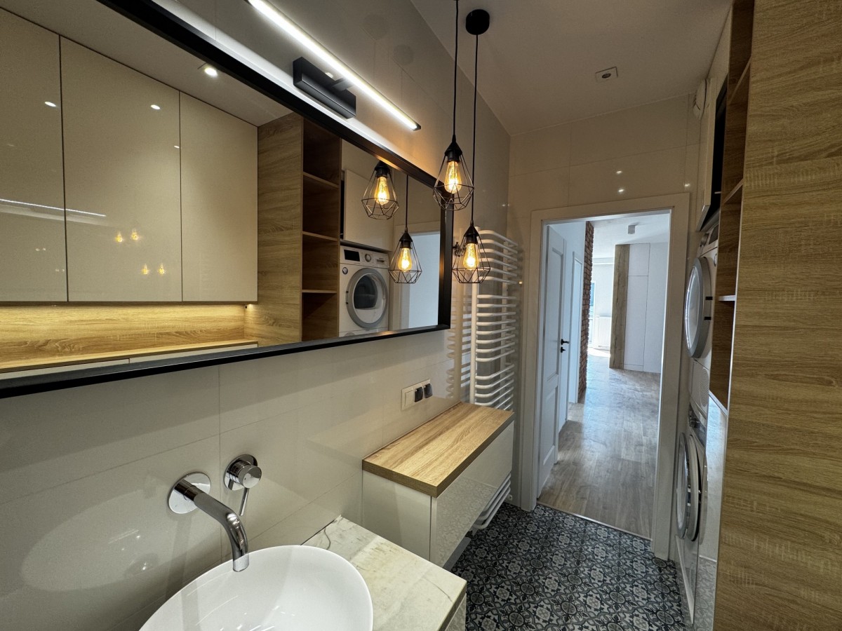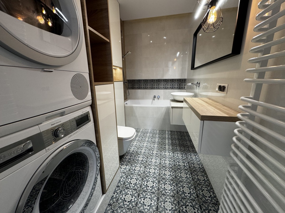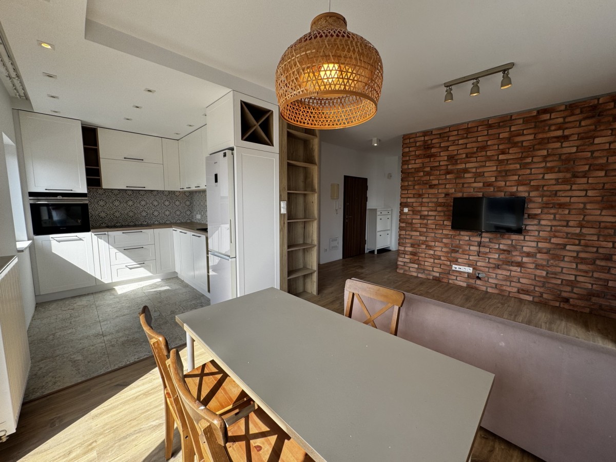 - Nowoczesne wykończenie - mieszkanie gotowe do zamieszkania, wykończone w wysokim standardzie. Ceglana ściana w salonie, jasna kuchnia w zabudowie oraz elegancka łazienka z wanną i pralka i suszarką tworzą spójną i stylową całość.