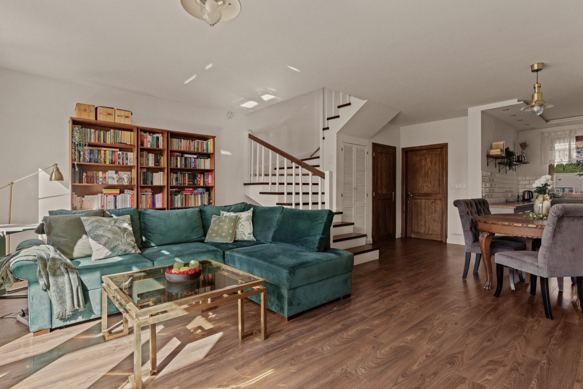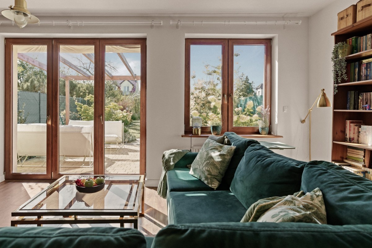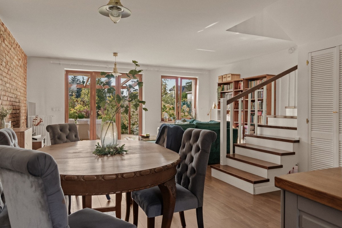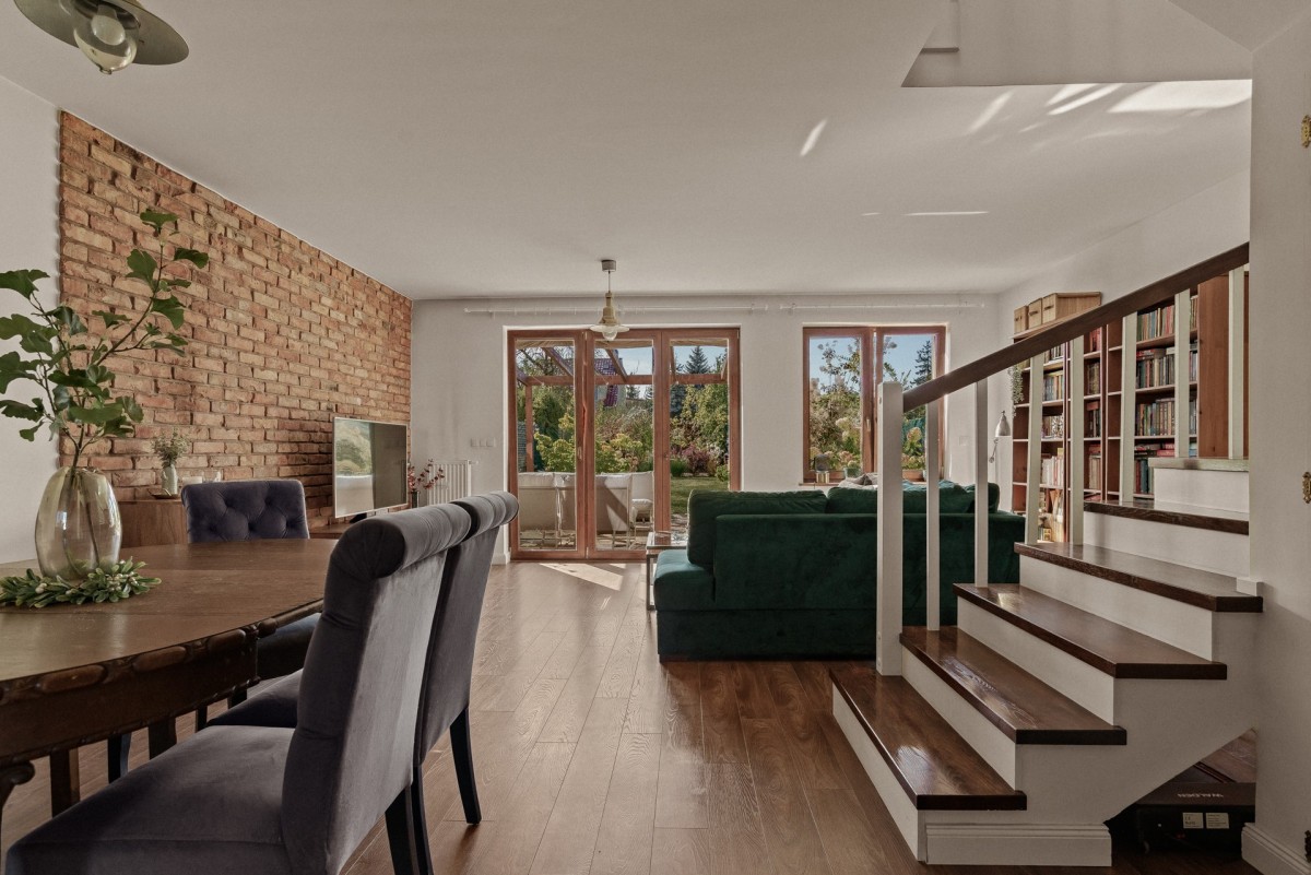 Salon 36 m² z tarasem 18 m² | Ogród większy niż w szeregówkach | Dwupoziomowy układ | Bezczynszowe | Ogrzewanie podłogowe + piec DeDietrich | Rolety antywłamaniowe | Ściana z cegły w salonie | 5 min pieszo do lasu i Rusałki