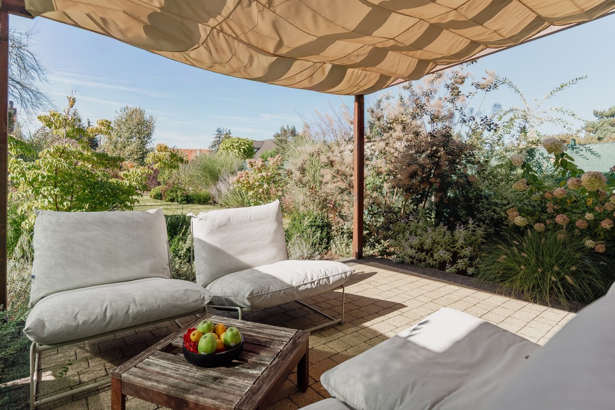 * salon z jadalnią 36 m² + taras 18 m² i ogród ok. 140 m²,