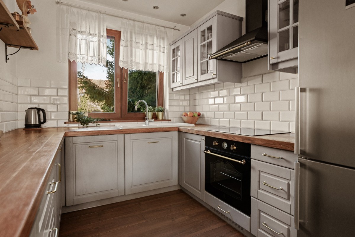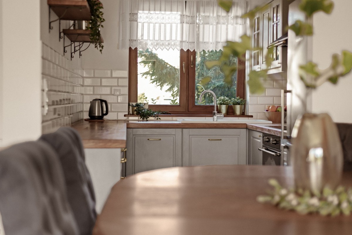 * kuchnia: drewniana zabudowa wykonana przez stolarza, pełne AGD (indukcja, piekarnik, zmywarka, lodówka),
