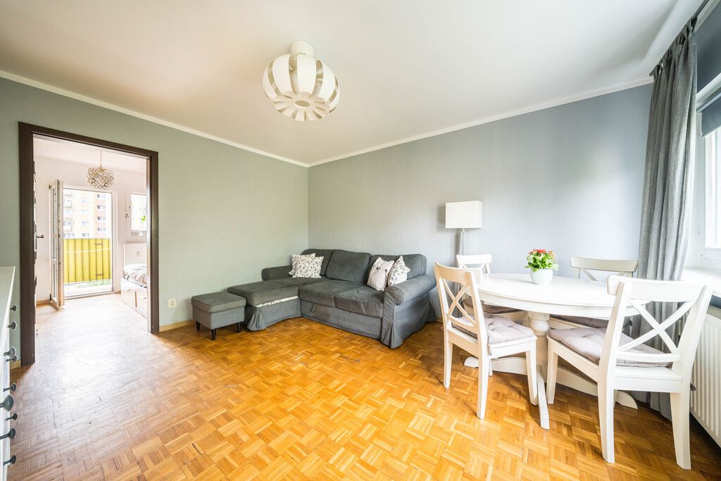 Mieszkanie o powierzchni 45 m², położone w niskim bloku z 1965 roku.