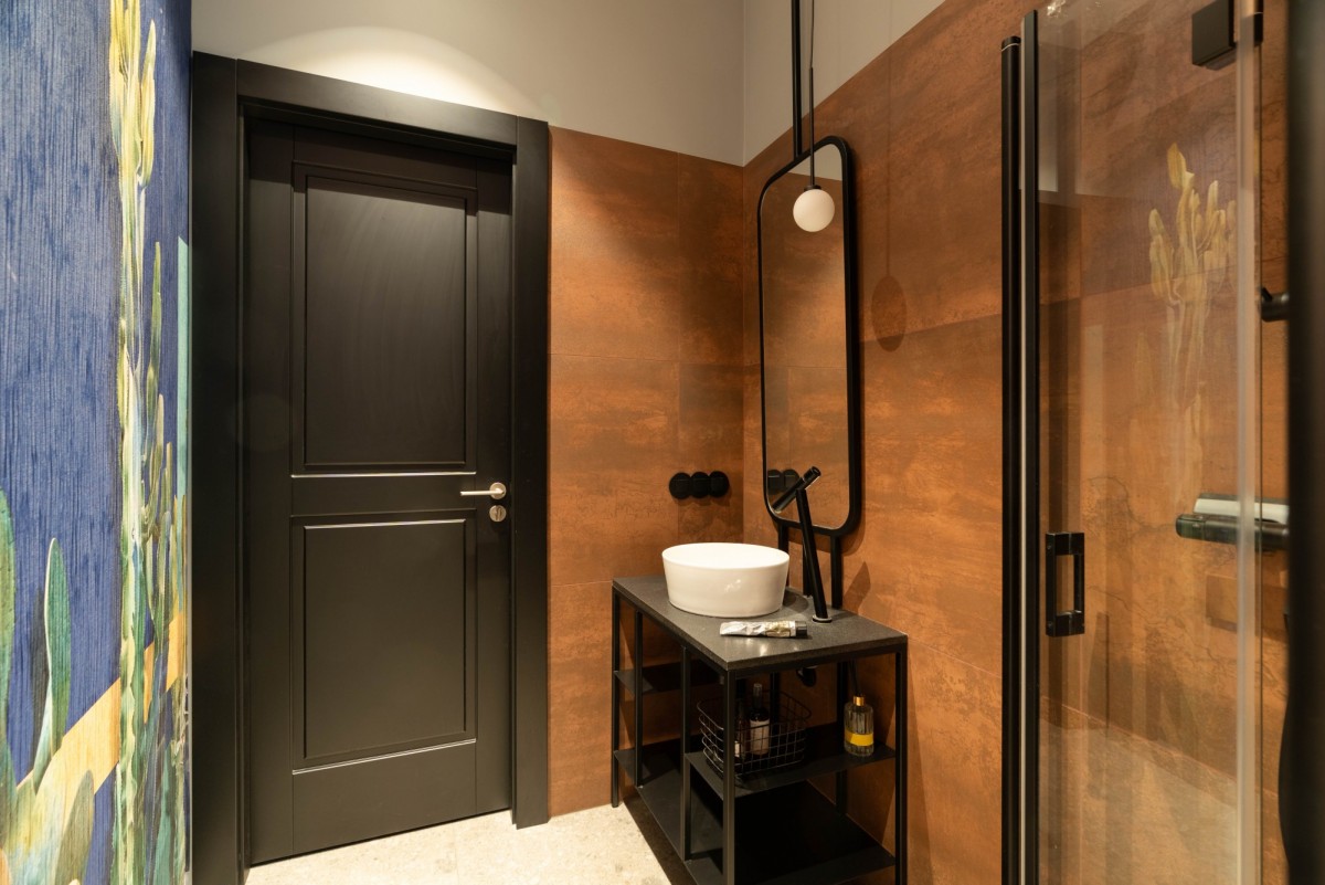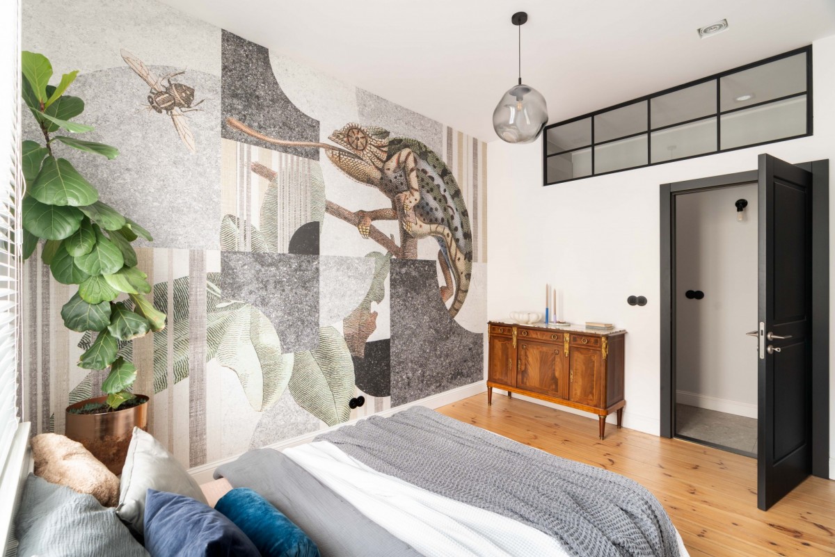 - unikatowy styl - tapety, detale, czarne drzwi i loftowe przeszklenia