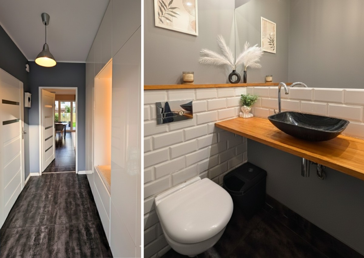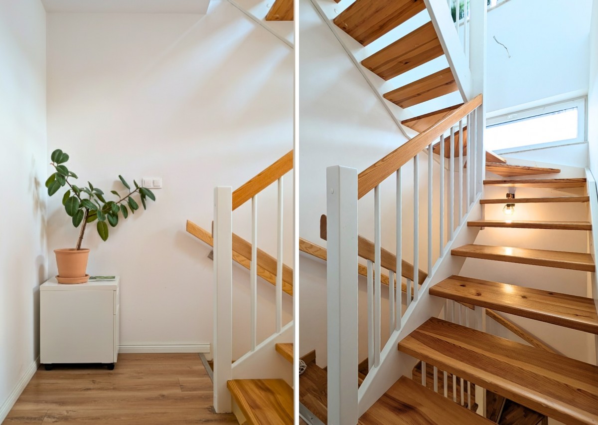 Komunikacja - z zamykaną spiżarnią/schowkiem pod nowoczesnymi, dębowymi schodami.