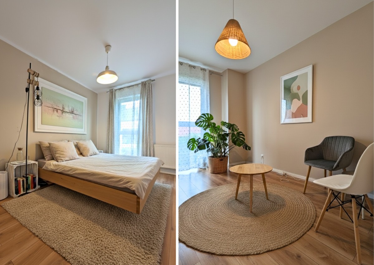 Otwarty, jasny i pełnowymiarowy pokój (ok. 30 m² po podłodze) - zaadaptowany na cele mieszkalne, wliczony w powierzchnię użytkową, z klimatyzacją.