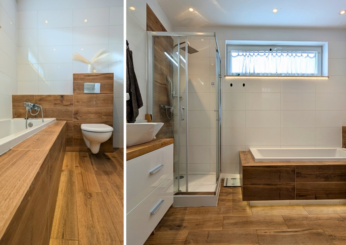 Łazienka - nowocześnie urządzona, z wanną oraz prysznicem i zabudową drewnianą