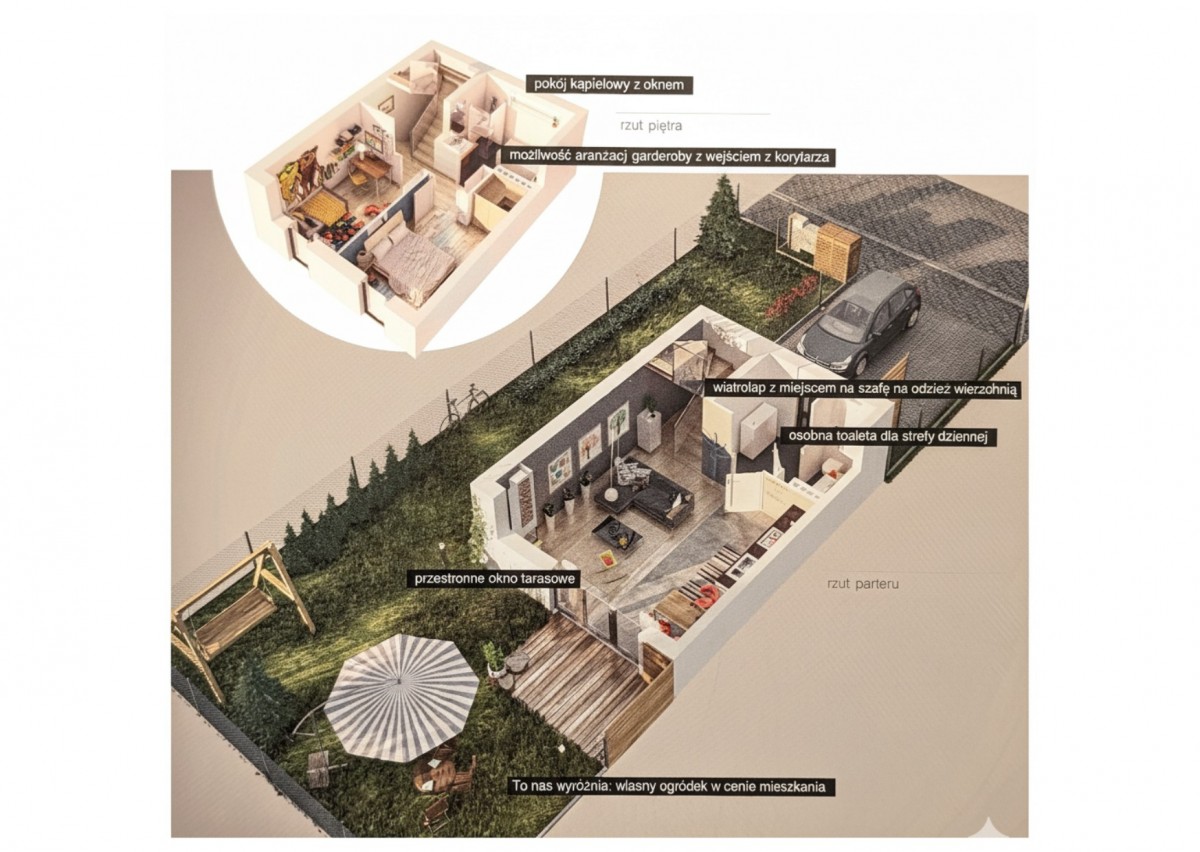 WIĘCEJ PRYWATNOŚCI I PRZESTRZENI - jako skrajny segment budynek sąsiaduje tylko z jednej strony i posiada największy ogród w całej linii zabudowy.