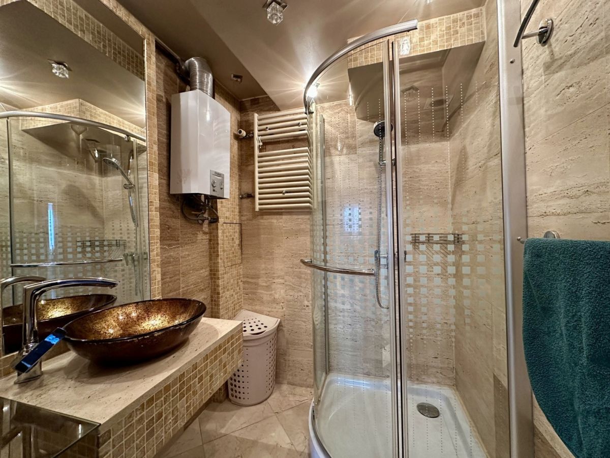 Łazienka gustownie wykończona. Jest kabina prysznicowa, duże lustro i piękna nablatowa umywalka.