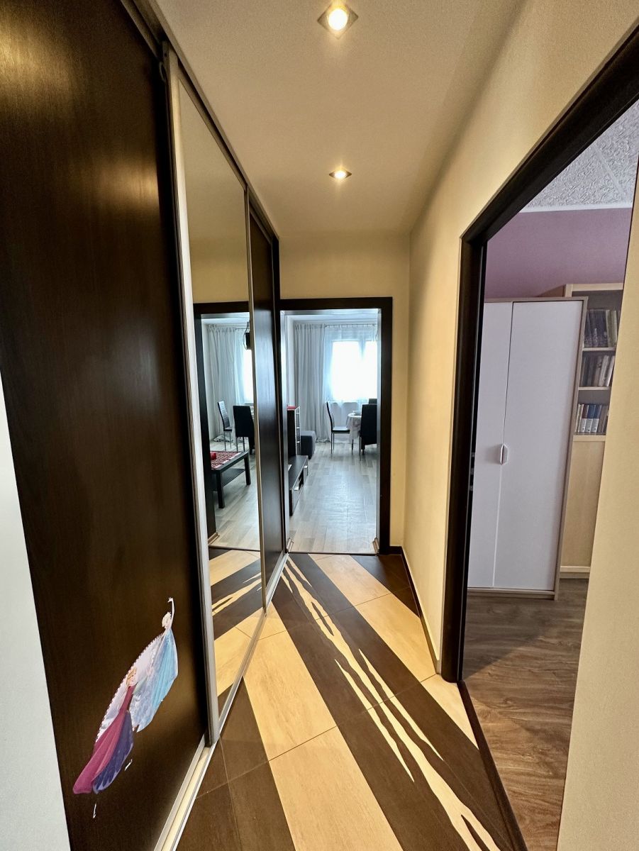 W przedpokoju duża szafa z drzwiami przesuwnymi, półka na buty, siedzisko, garderoba.