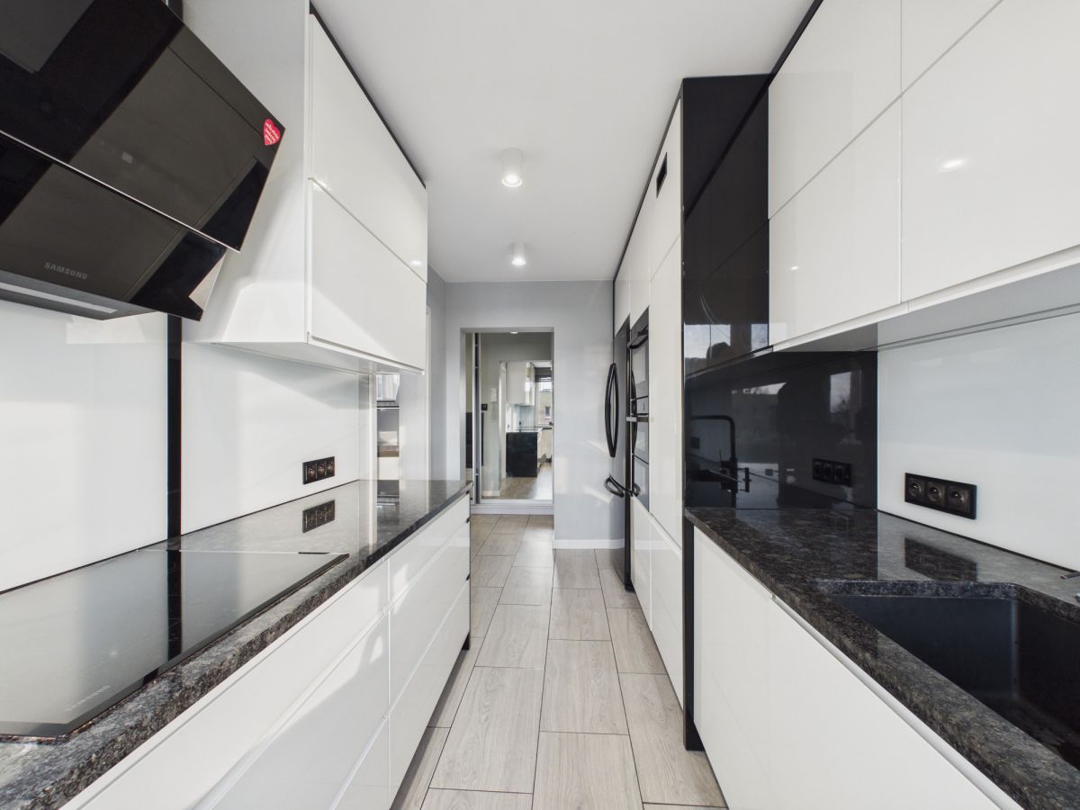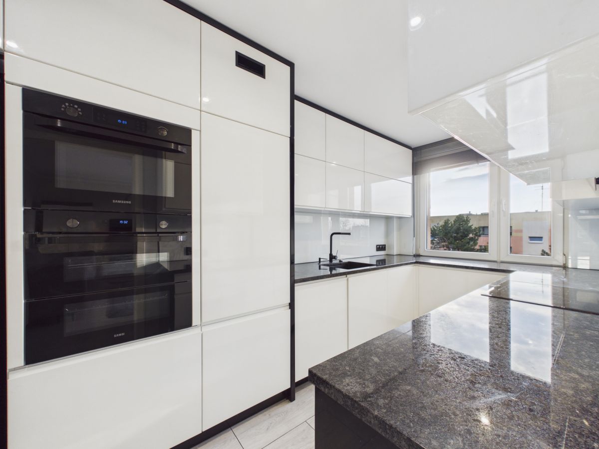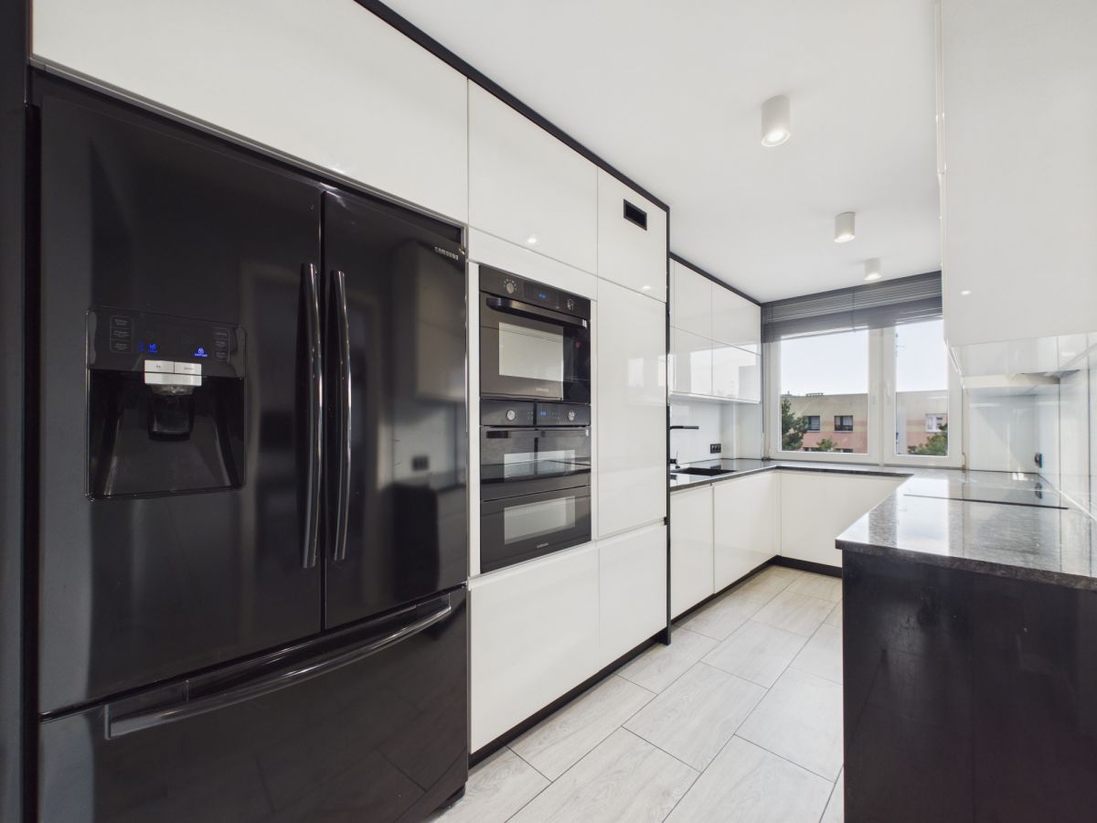 W kuchni znajduje się nowoczesna zabudowa meblowa wyposażona w wysokiej jakości sprzęt AGD marki Samsung, w tym: