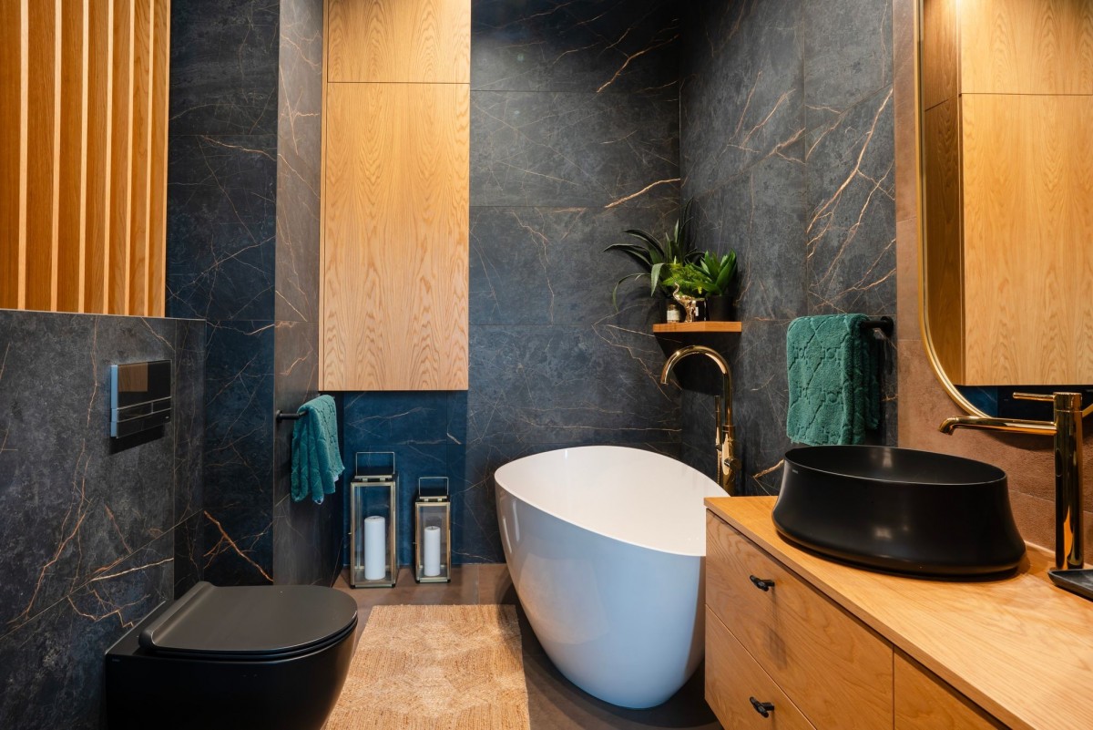W kuchni zastosowano sprzęty marek Miele, Franke, Falmec i AEG, a łazienki wykończono włoską ceramiką i armaturą premium.