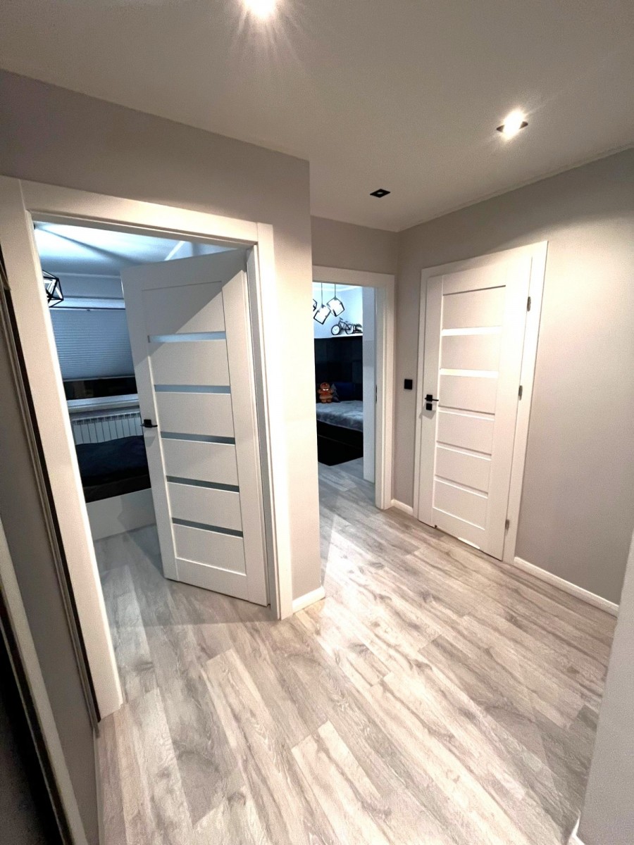 Na przedpokoju duża szafa zabudowana z wieszakami i półkami, miejscem na odkurzacz, suszarkę wolnostojącą. W sypialniach pojemne szafy.