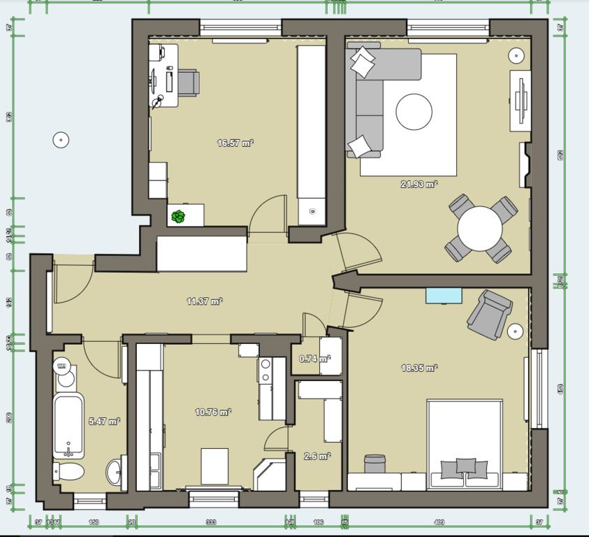 Trzy pokoje z osobną kuchnią z oknem, okna wychodzące na wschód i zachód; widok na inne budynki oraz zielone podwórko dookoła budynku.