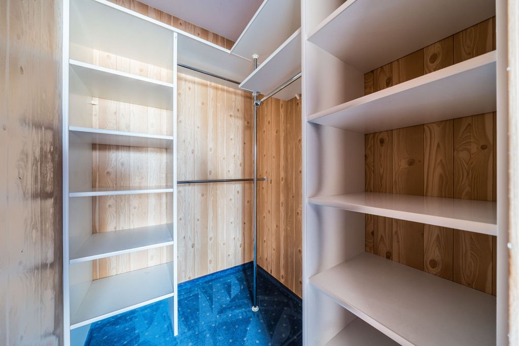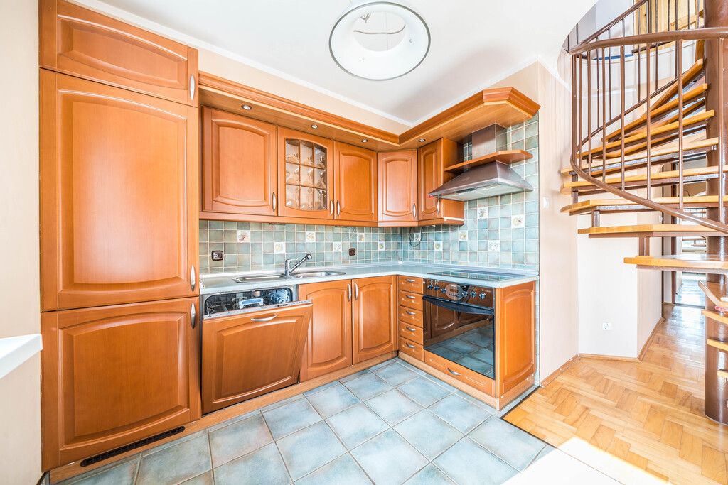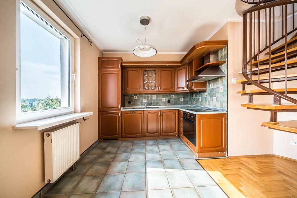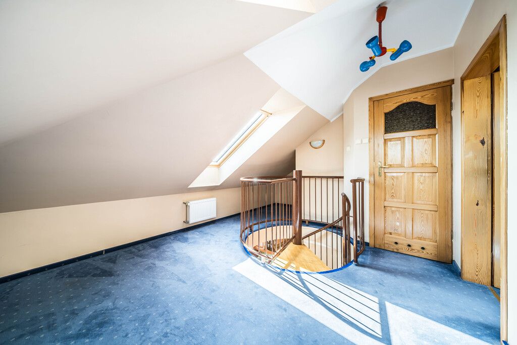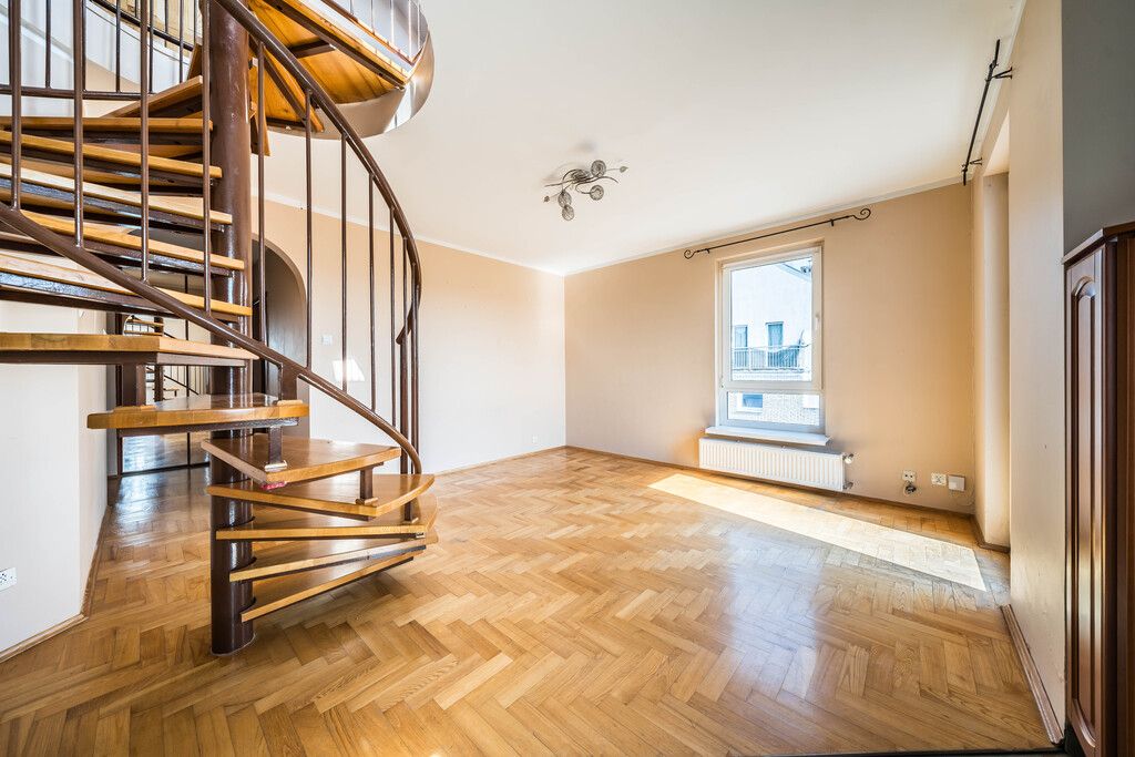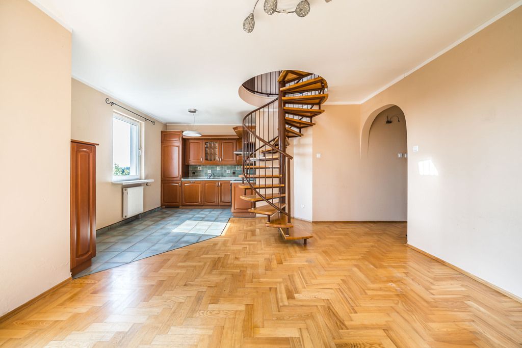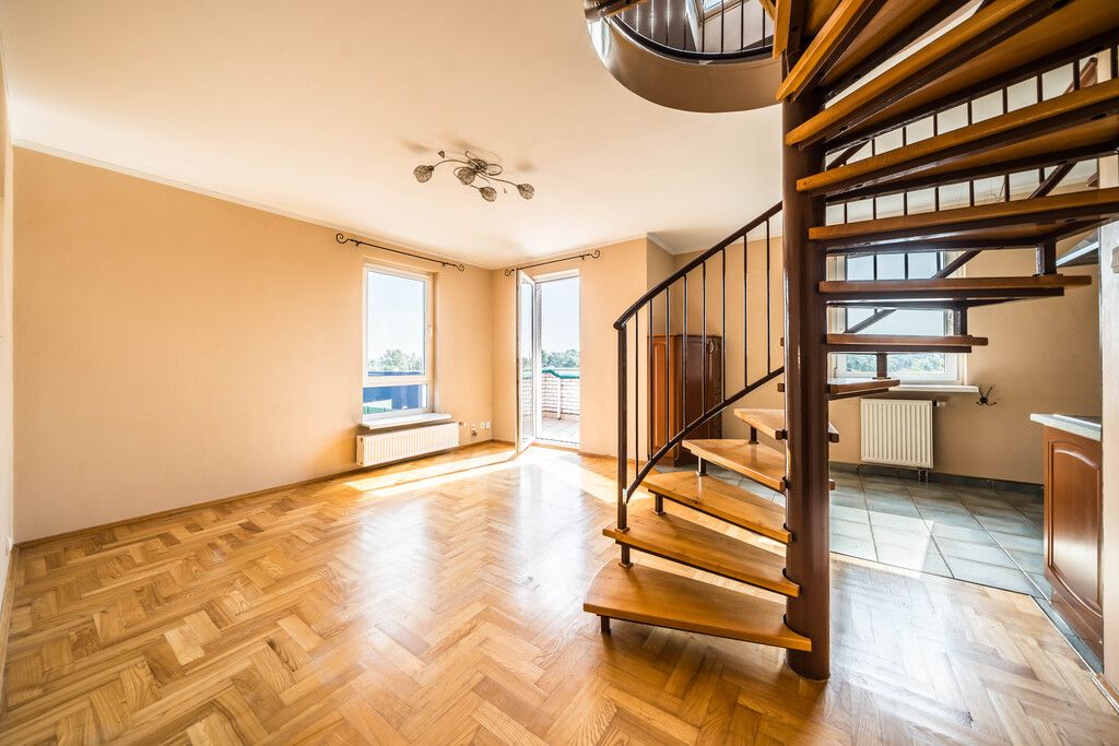 Pomiędzy salonem, a kuchnią znajdują się kręcone schody, które prowadzą na drugą kondygnację mieszkania, tu znajduje się: