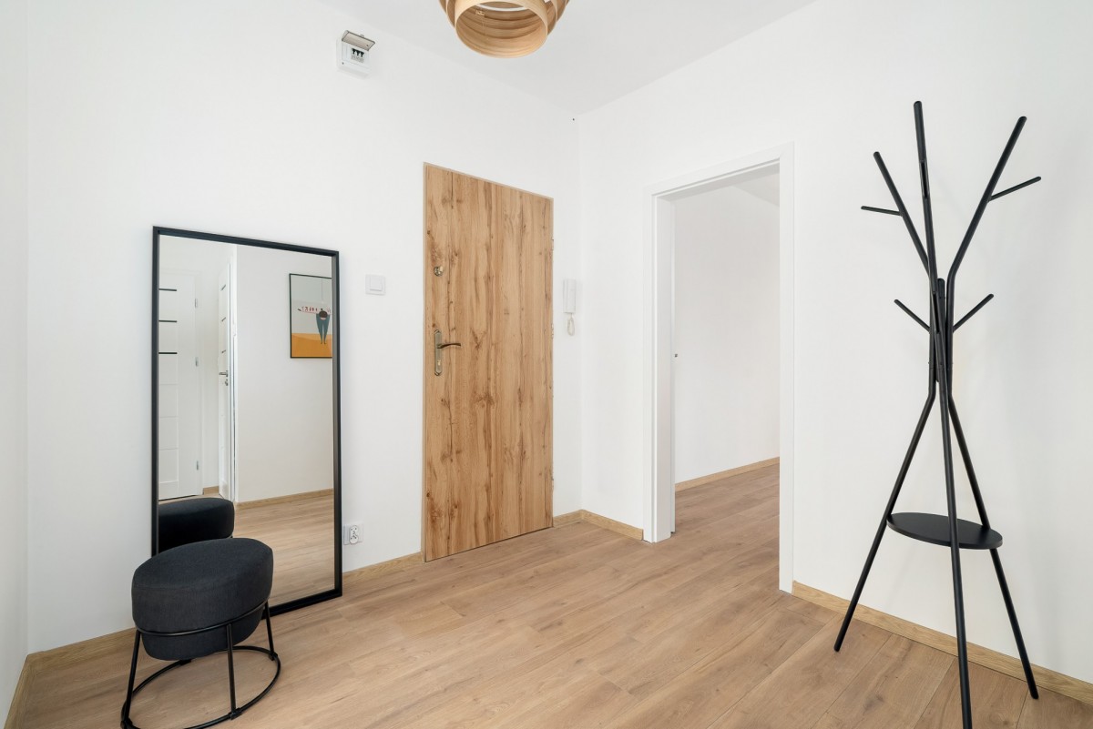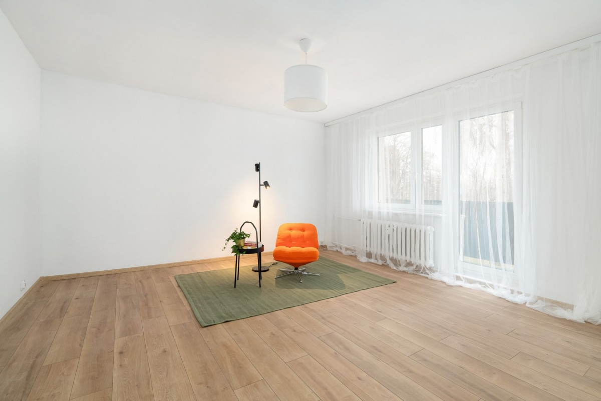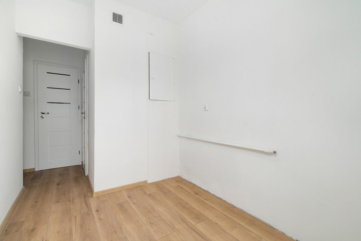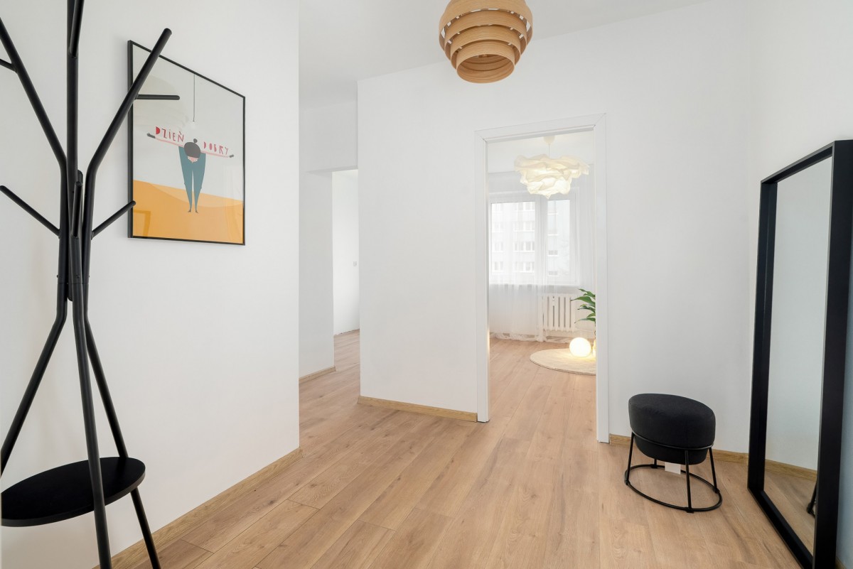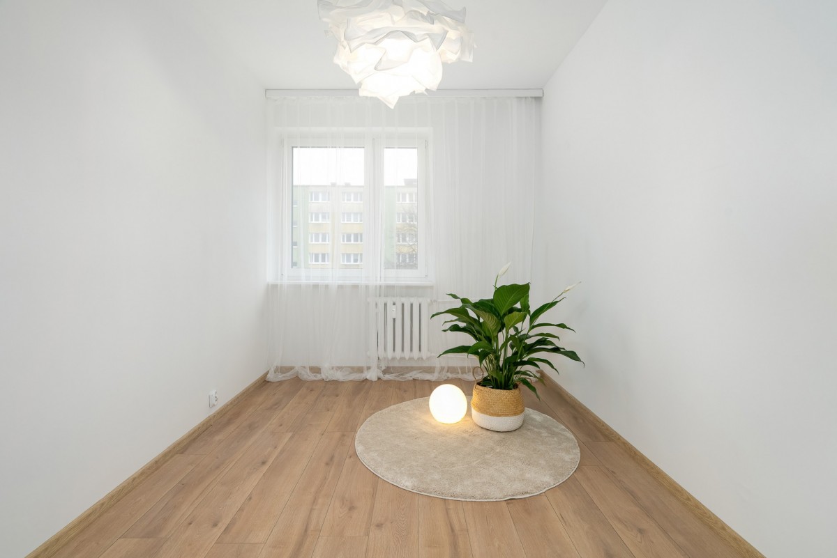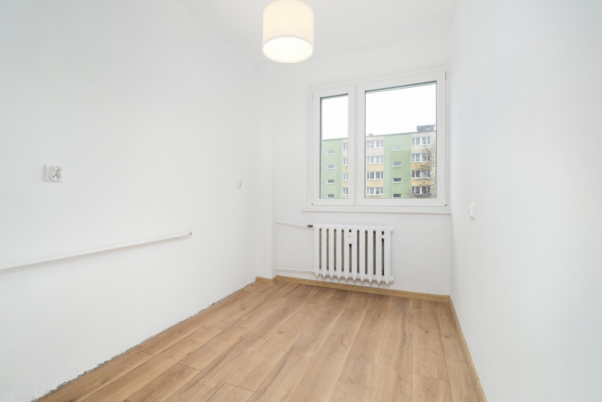 Mieszkanie jest po remoncie - ściany świeżo pomalowane na biało, nowe podłogi, drzwi i okna. To czysta, neutralna baza, gotowa do dalszej aranżacji według własnego pomysłu.