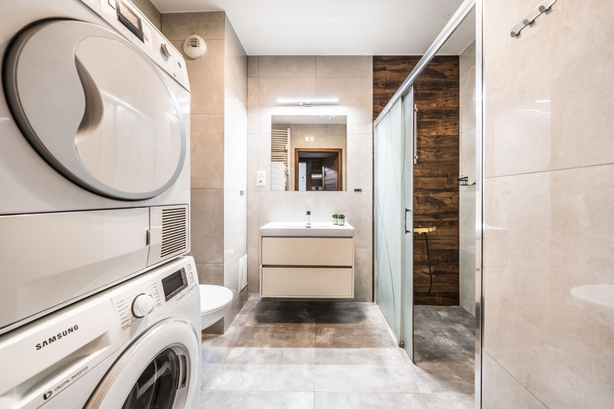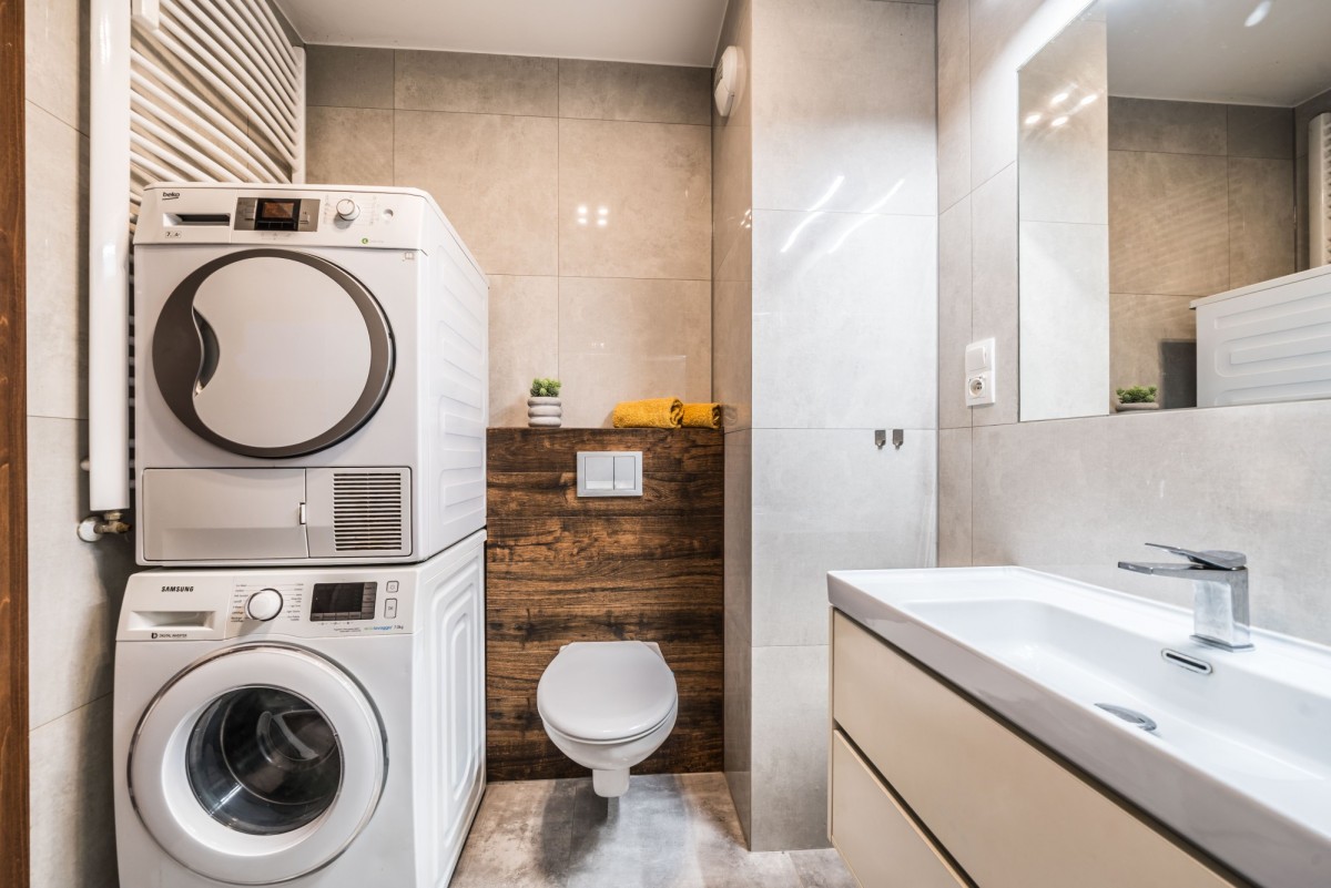 - pionowa zabudowa z miejscem na pralkę i suszarkę.