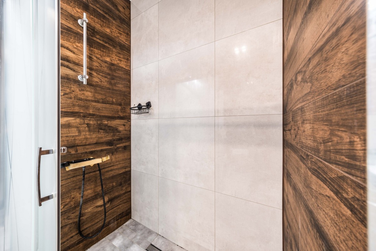 - duża, nowoczesna kabina prysznicowa typu walk-in z odpływem liniowym.