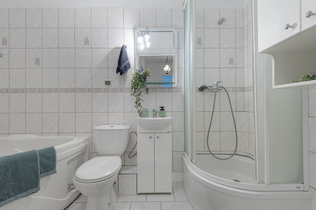 Łazienka o powierzchni ponad 5 mkw została zaprojektowana tak, by łączyć funkcjonalność i wygodę. Wyposażona jest w wannę i oddzielny prysznica, umywalkę, toaletę oraz szafki do przechowywania kosmetyków i akcesoriów.