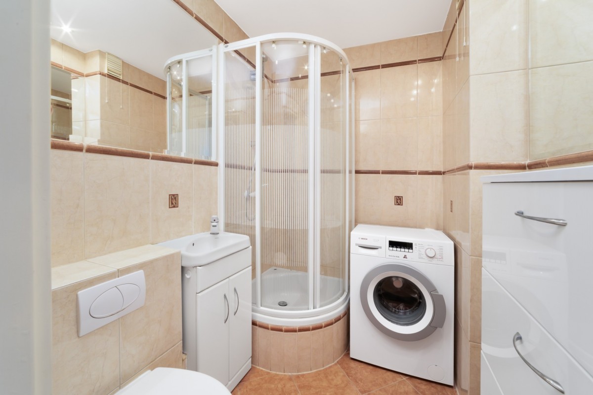 - łazienka z kabiną prysznicową i miejscem na pralkę,