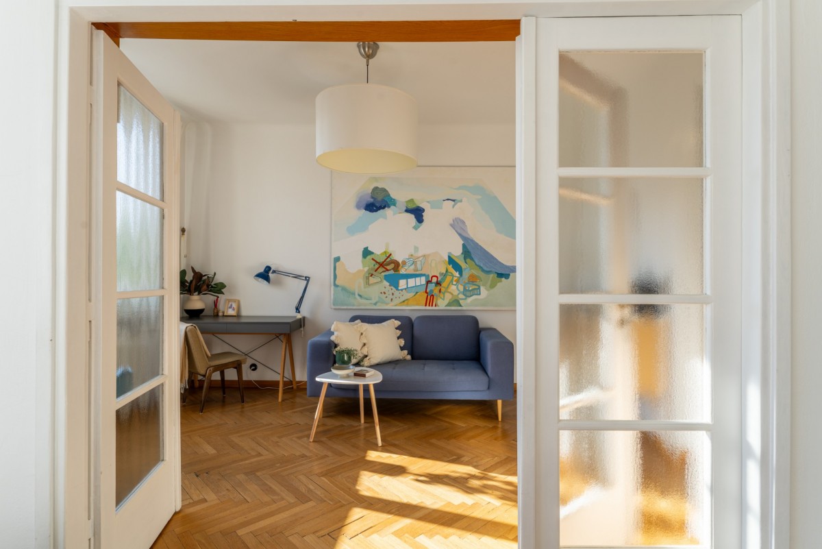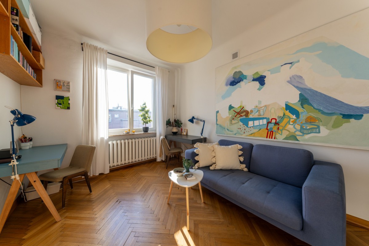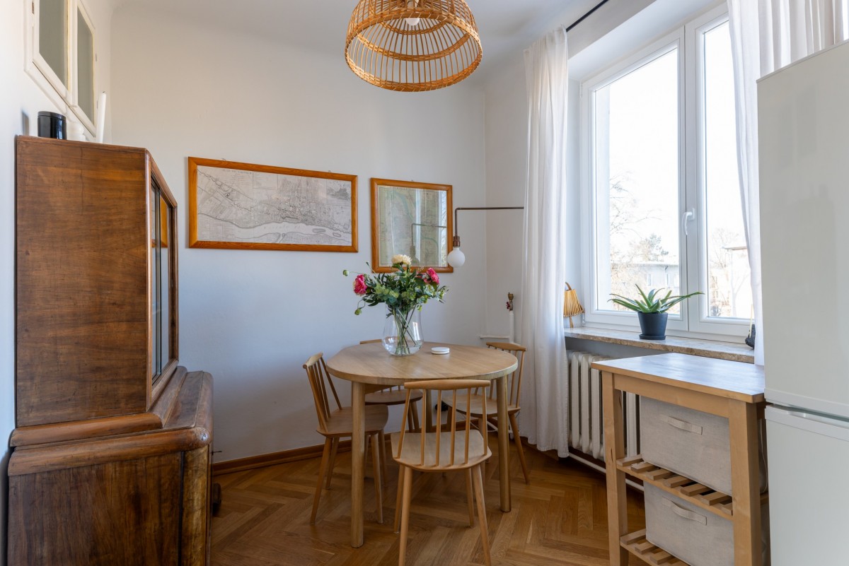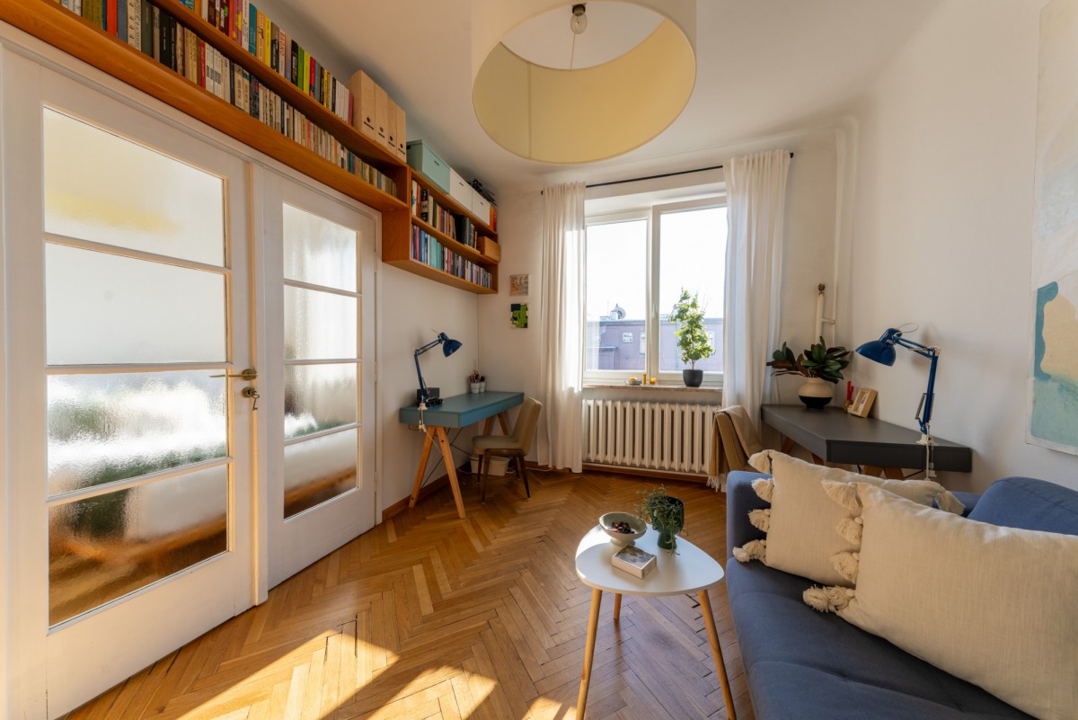 Tym, co czyni wnętrze wyjątkowym jest klimat starej architektury, który został zachowany podczas generalnego remontu w 2015 roku (łazienka w 2020). Oryginalny parkiet, drewniane drzwi, świetlik w łazience, pawlacze i szafa wnękowa w przedpokoju - każdy z detali buduje atmosferę tego miejsca z historią. Szczególny element stanowi duże przeszklenie z trójskrzydłowymi drzwiami, które dodaje wnętrzu lekkości, a jednocześnie subtelnie wydziela strefę prywatną.