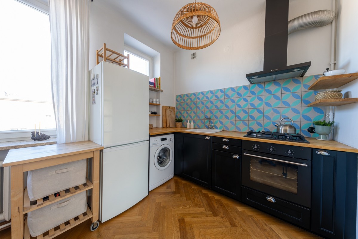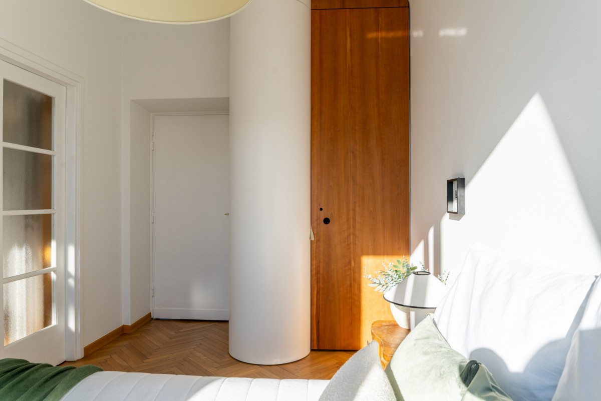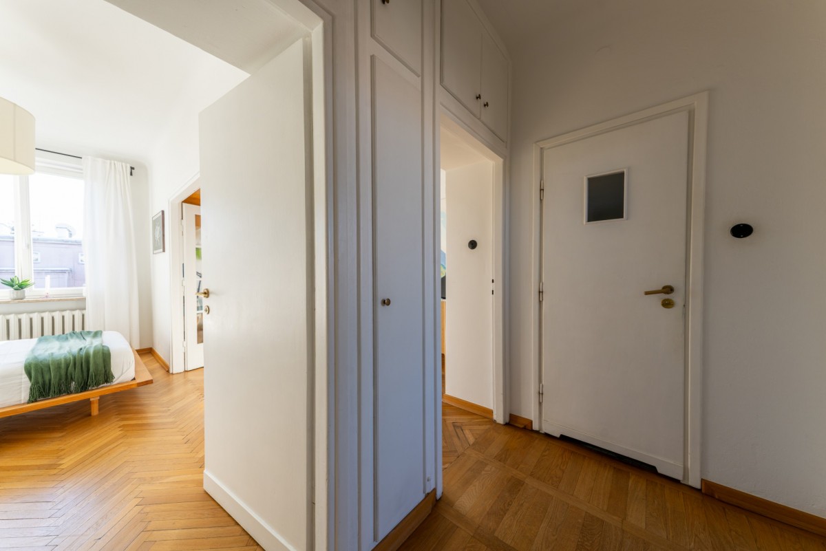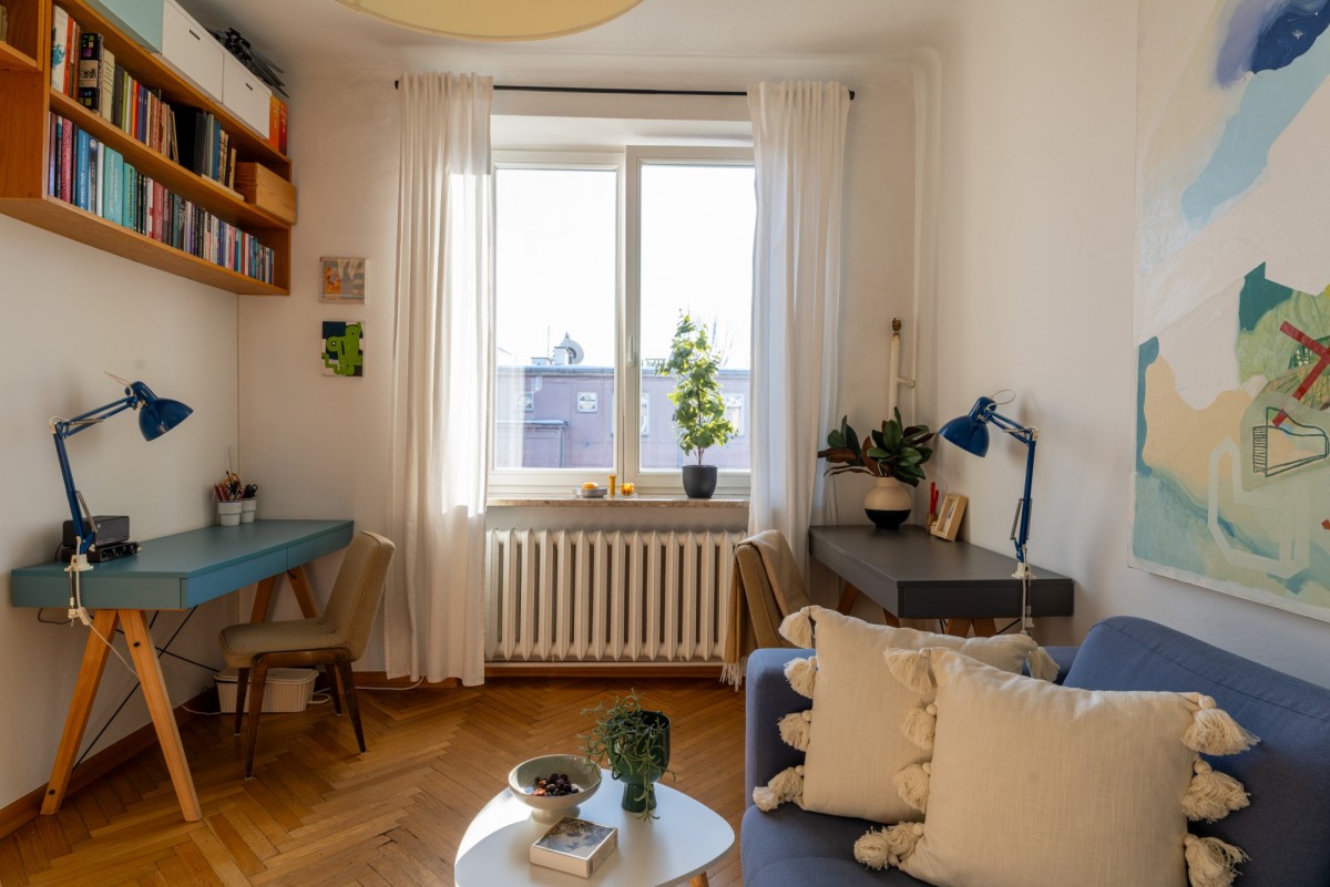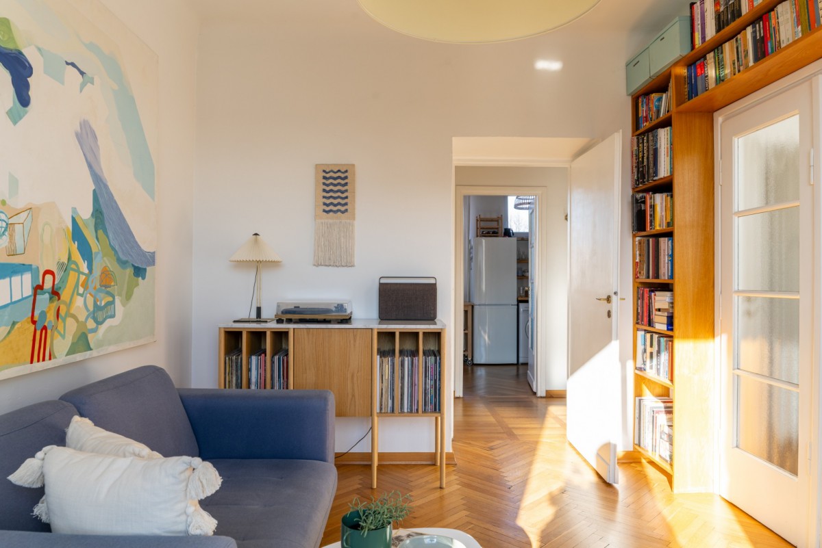 Tym, co czyni wnętrze wyjątkowym jest klimat starej architektury, który został zachowany podczas generalnego remontu w 2015 roku (łazienka w 2020). Oryginalny parkiet, drewniane drzwi, świetlik w łazience, pawlacze i szafa wnękowa w przedpokoju - każdy z detali buduje atmosferę tego miejsca z historią. Szczególny element stanowi duże przeszklenie z trójskrzydłowymi drzwiami, które dodaje wnętrzu lekkości, a jednocześnie subtelnie wydziela strefę prywatną.