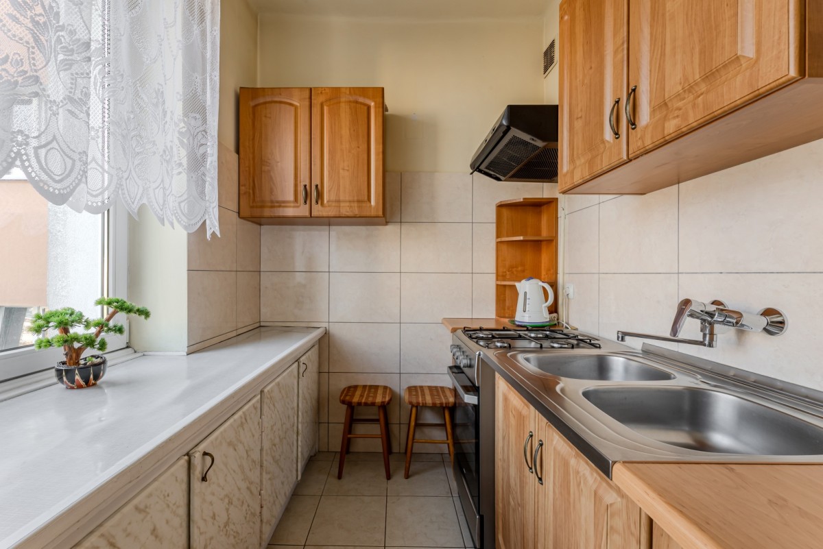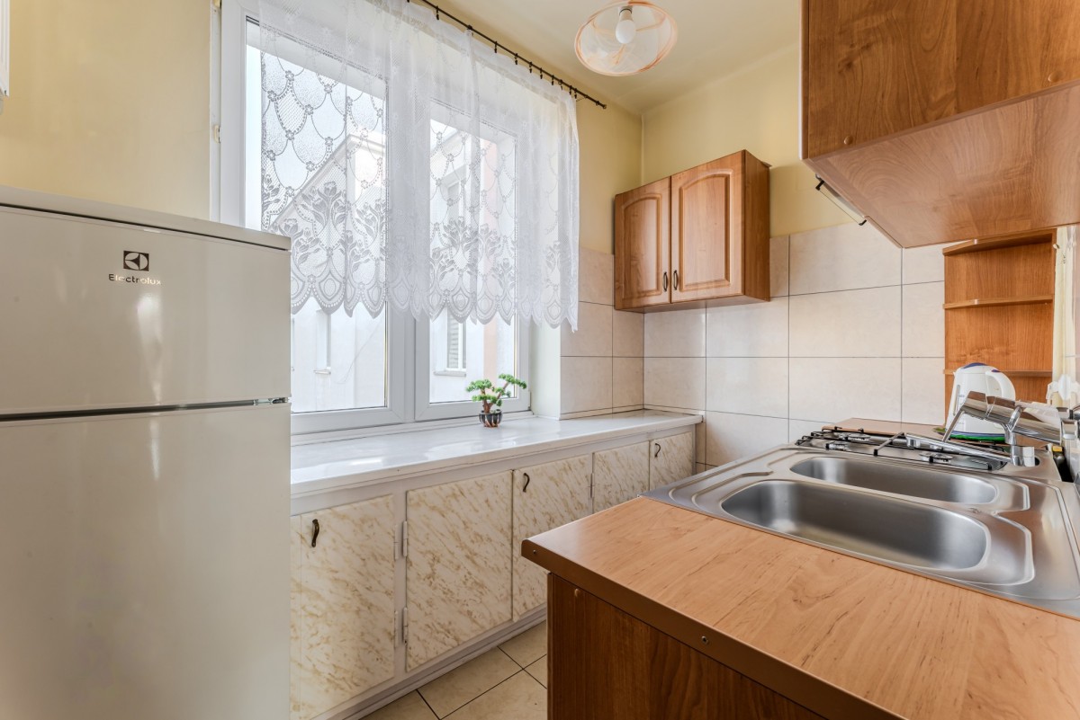 - oddzielnej kuchni z oknem z ekspozycją na północ i widokiem na zielone, ciche patio, wyposażonej w zabudowę szafkową, lodówkę , kuchnie gazowo-elektryczną.