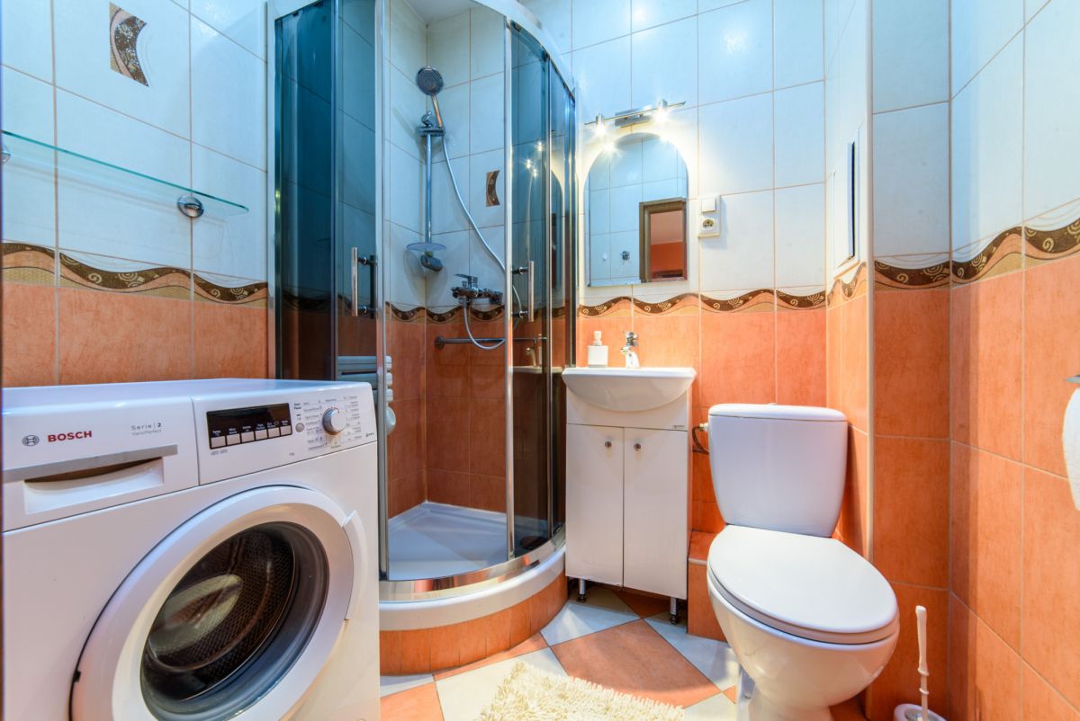 Łazienka (3,90m2) terakota i glazura, kabina prysznicowa pralka, szafka w zabudowie.